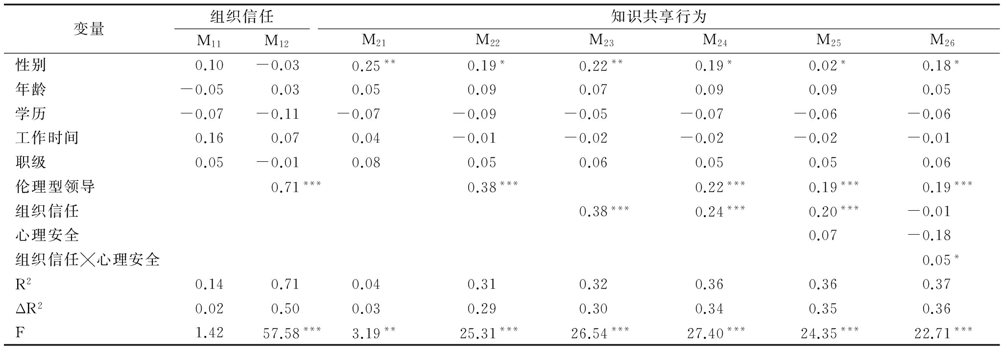 各变量的均值、标准差和相关系数如表2所示。可以看出,伦理型领导与知识共享行为(r=0.52,P<0.001)、组织信任(r=0.70,P<0.001)之间显著正相关,组织信任与知识共享行为(r=-0.54,P<0.001)显著正相关,初步验证了假设HI、H2、H3,为分析组织信任的中介效应提供了依据,可以作下一步的层级回归分析。