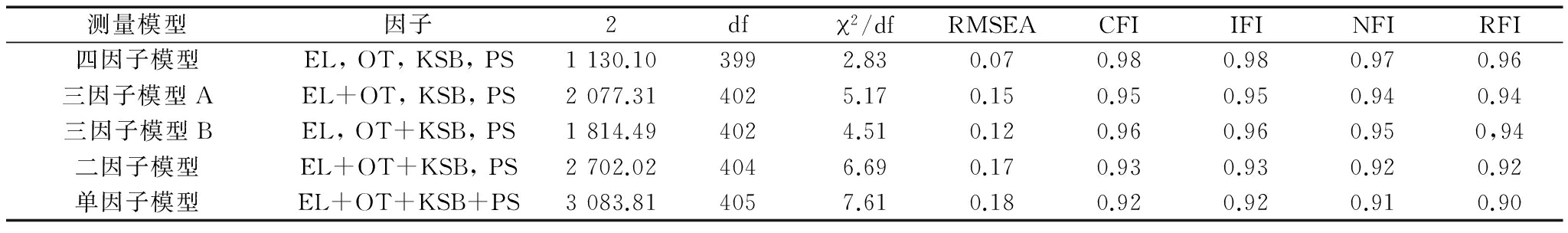 测量模型因子2df2/dfRMSEACFIIFINFIRFI四因子模型EL,OT,KSB,PS1130.103992.830.070.980.980.970.96三因子模型AEL+OT,KSB,PS2077.314025.170.150.950.950.940.94三因子模型BEL,OT+KSB,PS1814.494024.510.120.960.960.950,94二因子模型EL+OT+KSB,PS2702.024046.690.170.930.930.920.92单因子模型EL+OT+KSB+PS3083.814057.610.180.920.920.910.90