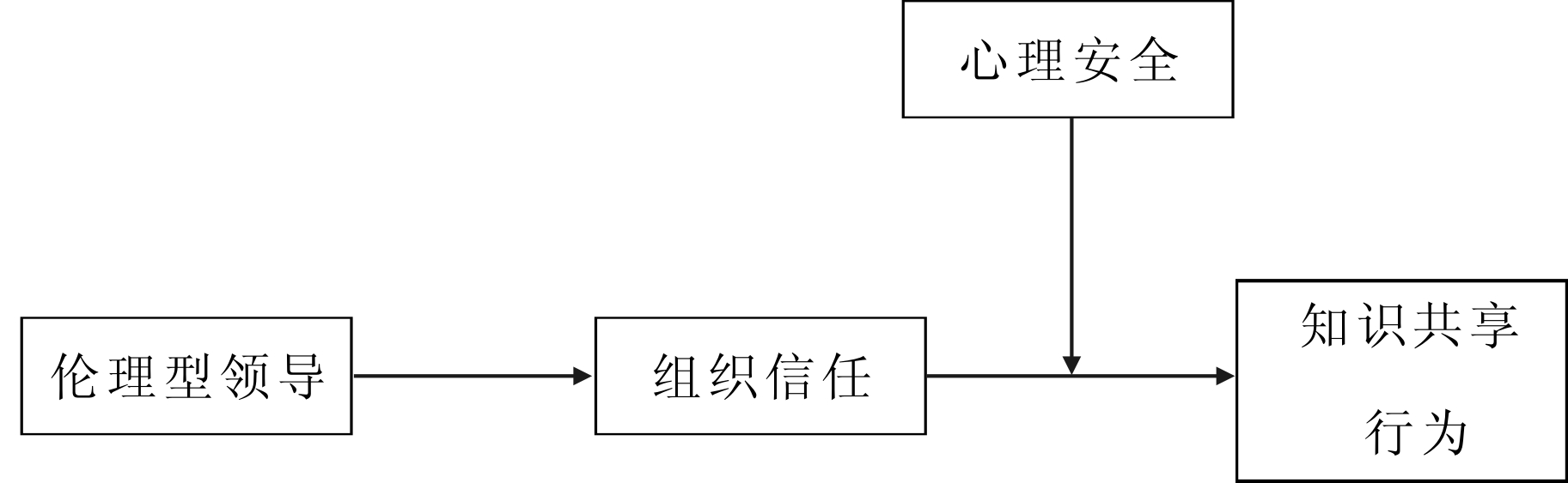 领导可以通过自身榜样力量影响员工,也可以通过其它行为影响员工。依据社会交换理论,员工进行知识共享是对受到伦理型领导关心、支持和信任的交换与回报,即伦理型领导通过信任提升员工的知识共享行为。同时,知识共享行为取决于个体自愿,是个体将独有知识有选择地传递或贡献给其他个体的一系列行为,这种行为可能会降低员工个体的竞争优势。心理安全作为一种积极的心境和态度,在组织信任度较高的环境下能使员工以更加开放的心态与他人分享知识,因而能够有效调节组织信任与知识共享行为关系。综上所述,本文引入组织信任作为中介变量、心理安全作为调节变量,探讨伦理型领导对员工知识共享行为的内在影响机理,以深入挖掘伦理型领导对员工的积极作用,充实伦理型领导研究。