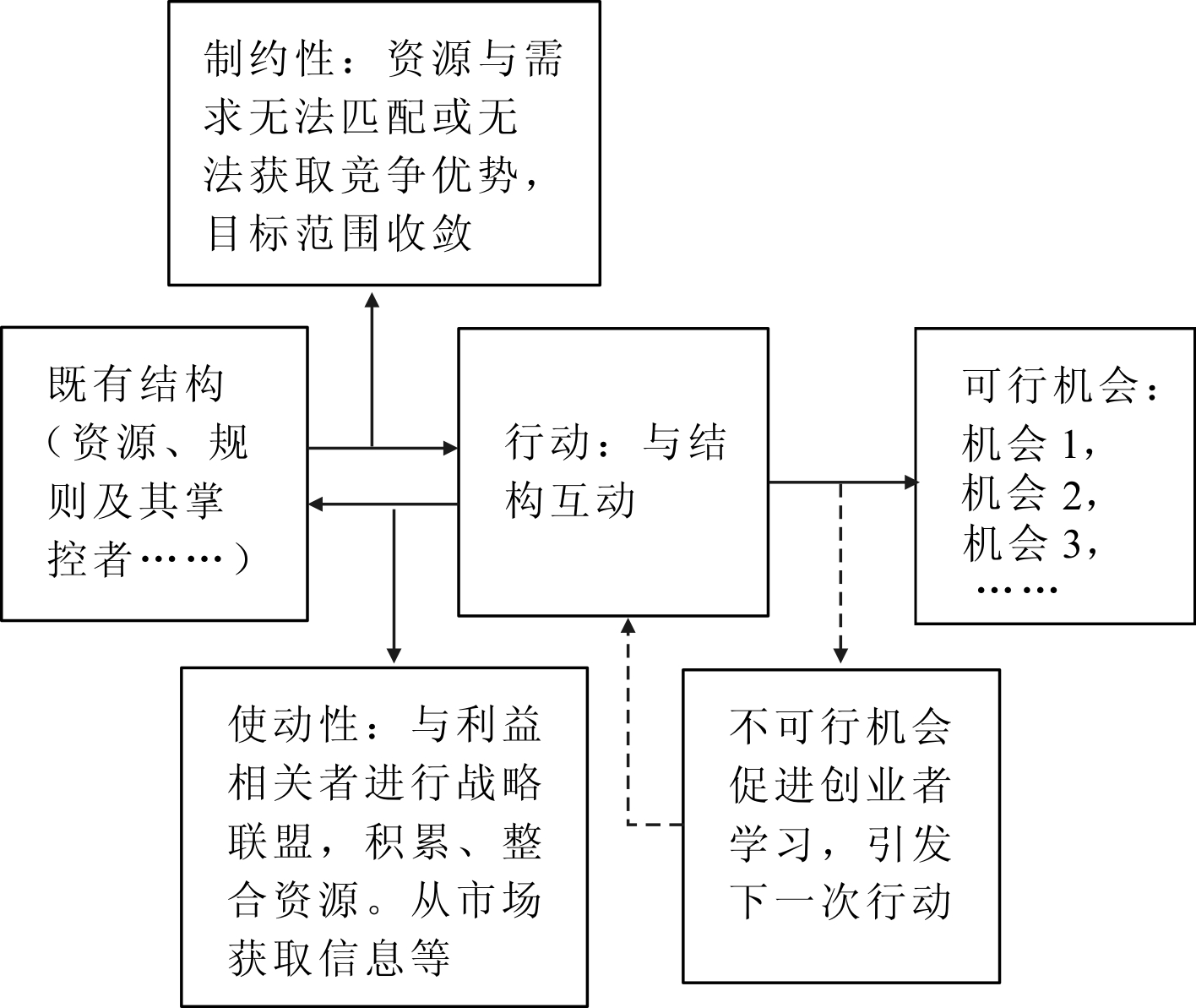 整合模型利用建构主义结构与行动的二重性建构了基本框架,突出结构与行动之间的使动性和制约性作用,将机会创造视为既有结构和创业主体行动之间的建构过程。既有结构是创业行为的起点,除了资源和规则,还有资源和规则的掌控者——创业主体。由于结构对创业主体具有制约作用,创业主体也是规则的适应者,创业主体从既有结构出发,直接开展创业行动,即机会创造。创业行动包含很多内容,如从结构中获取资源、知识,寻求战略联盟,整合资源等。总的来说,创业主体的机会创造行为都建立在与结构互动的基础上。在与既有结构互动过程中,创业主体受到既有结构使动性和制约性双重作用——创业主体需利用结构中的资源和规则以激发自身能动性。但是结构中创业情境不确定性、市场动态性,以及消费者需求与市场供应日趋平衡,创业主体利用现有资源已无法满足消费者需求或无法在市场竞争中获取核心优势,这时需要进一步激发自身能动性并与结构进行持续互动以创造机会。创业者与结构互动主要体现在寻求利益相关者,与之结成战略联盟,以及利用结构中发生的偶然性事件,这些活动均具有持续性特点。与利益相关者结成战略联盟进行资源整合是机会创造的基础,因为结构会根据市场变化进行资源整合。而偶然性事件可能包括新技术的产生、商业模式创新、市场变化等。此外,机会创造需要经过实践的再三检验,即试错,才能创造出切实可行的创业机会。试错过程是一个“干中学”的过程,即学习过程,创业主体在机会创造实践中不断学习,并诱发下一次机会创造行为。创业主体在这样持续性的与结构互动中,通过持续的失败学习,逐渐收敛目标范围,创造出可行的机会并付诸实施,这样的机会创造行为同样也改变了结构。结构和行动在相互建构的循环中逐渐打破现有市场平衡,这也是各种各样创业现象不断出现的原因。