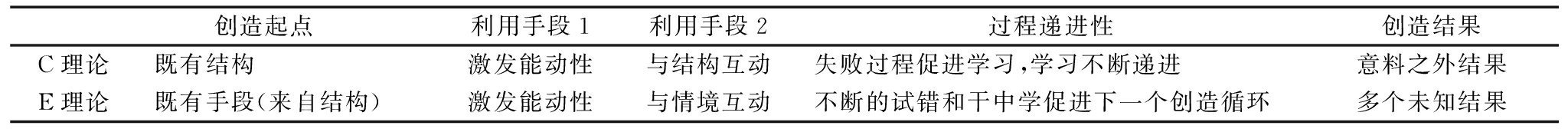 创造起点 利用手段1利用手段2过程递进性创造结果C理论既有结构激发能动性与结构互动失败过程促进学习,学习不断递进意料之外结果E理论既有手段(来自结构)激发能动性与情境互动不断的试错和干中学促进下一个创造循环多个未知结果