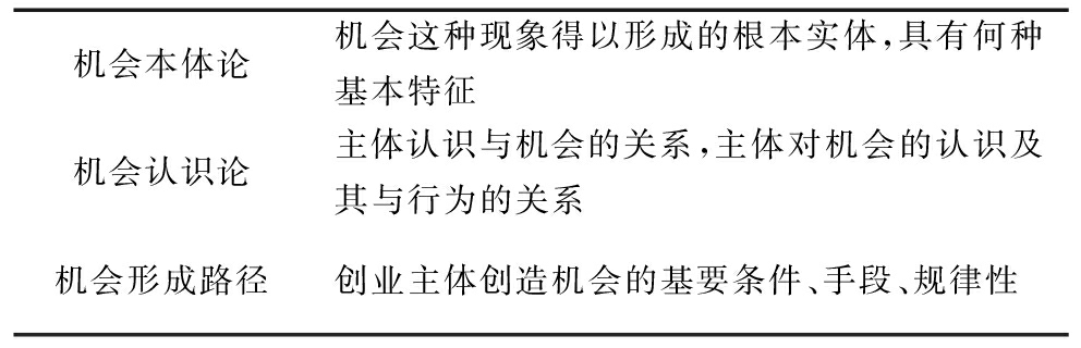 机会本体论机会这种现象得以形成的根本实体,具有何种基本特征机会认识论主体认识与机会的关系,主体对机会的认识及其与行为的关系机会形成路径创业主体创造机会的基要条件、手段、规律性