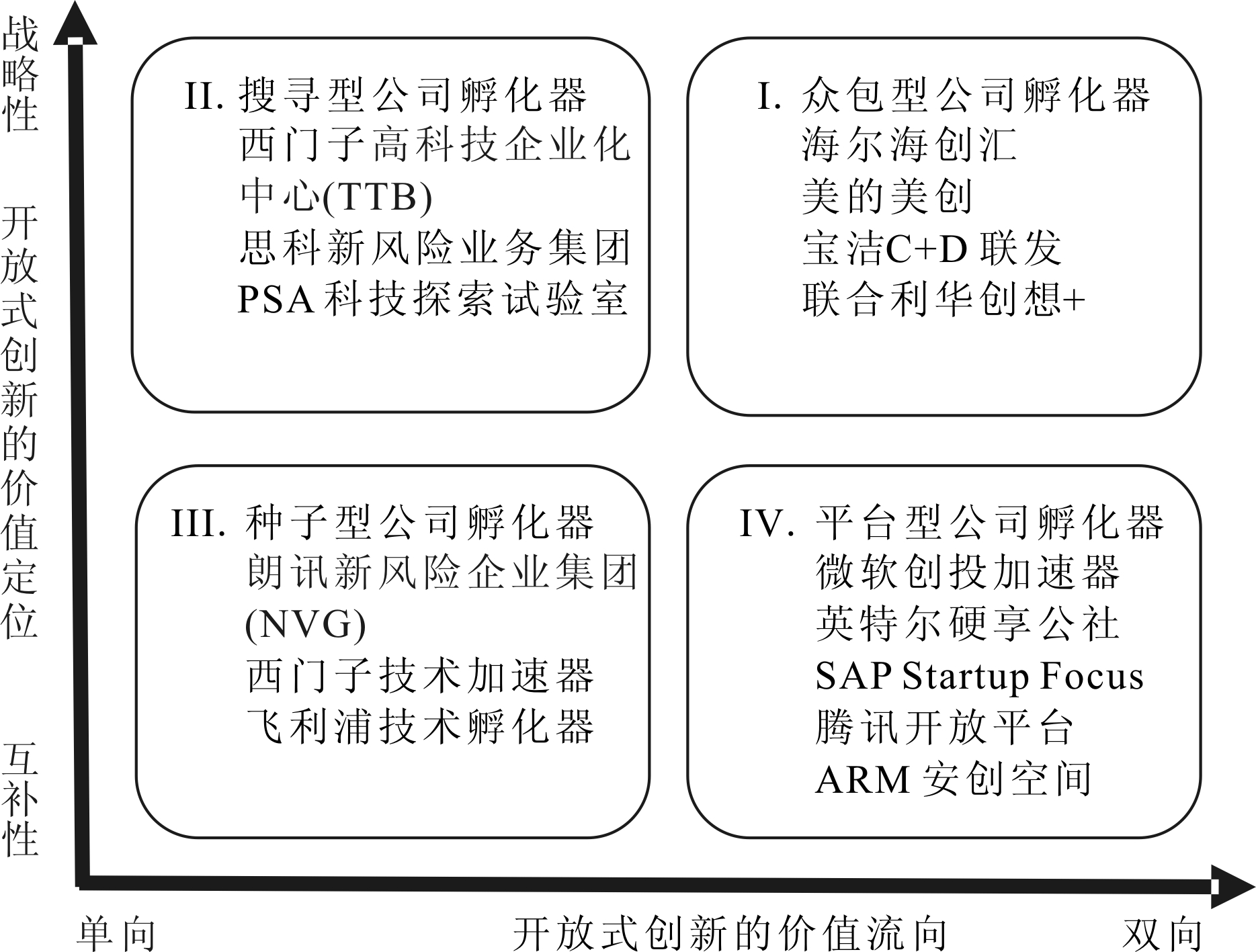 开放式创新侧重点的差异造就了公司孵化器不同的运营模式。本文以“开放式创新的价值流向”和“开放式创新的价值定位”为坐标轴,将公司孵化器的运营模式分为4种类型(见图2),即众包型、搜寻型、平台型和种子型,并在图2中列出了各类型中比较有代表性的公司孵化器。价值流向维度描述的是公司孵化器践行开放式创新的方式,单向价值流向侧重于内向或外向开放式创新中的一项,双向价值流向则将这两项结合起来。价值定位维度刻画的是公司孵化器践行开放式创新的目的。战略性定位旨在通过探索新技术或新创意,塑造母公司战略性竞争优势;互补性定位则偏重于应用已知技术或创意,获取互补性商业价值和商业知识。
