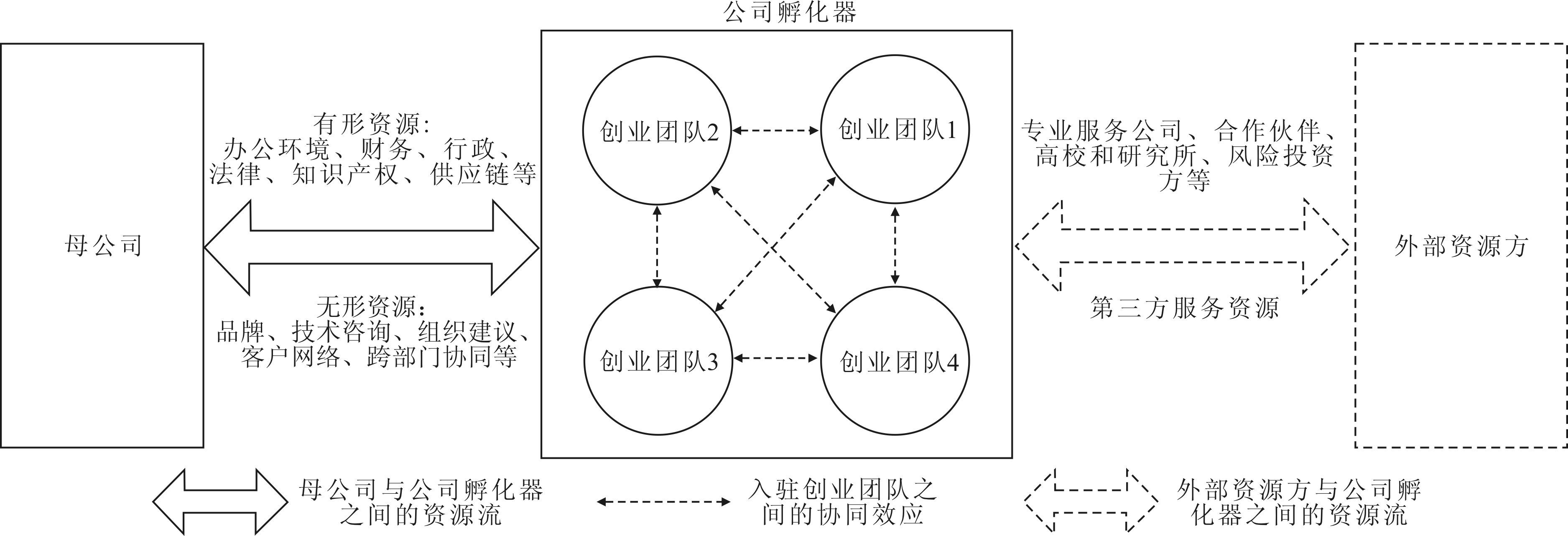 图1显示了公司孵化器网络结构以及相应的资源流。可见,相较于传统孵化网络中的三方结构,公司孵化器的网络体系加入了作为主要资源提供方的母公司,结构更为复杂。在引入外部资源方的同时,公司孵化器在运营中肩负母公司与创业团队之间资源对接的功能,并将两者在一定程度上予以隔离,弱化了彼此在激励机制以及公司文化上的冲突。