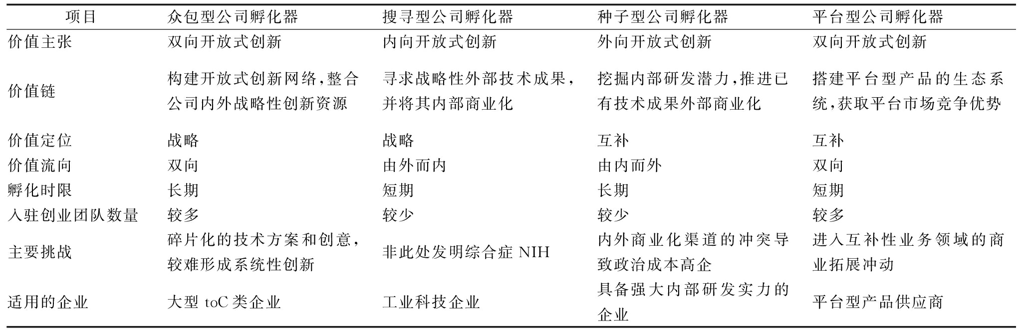 表1 不同类型公司孵化器比较