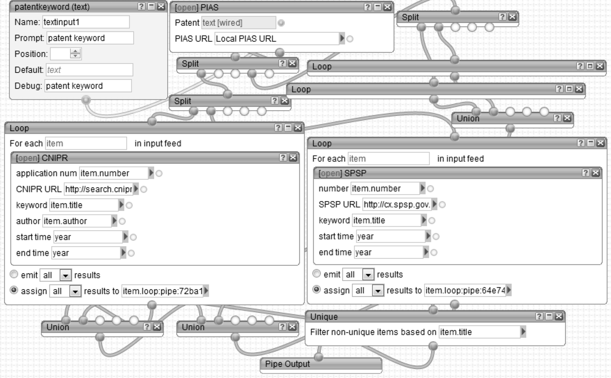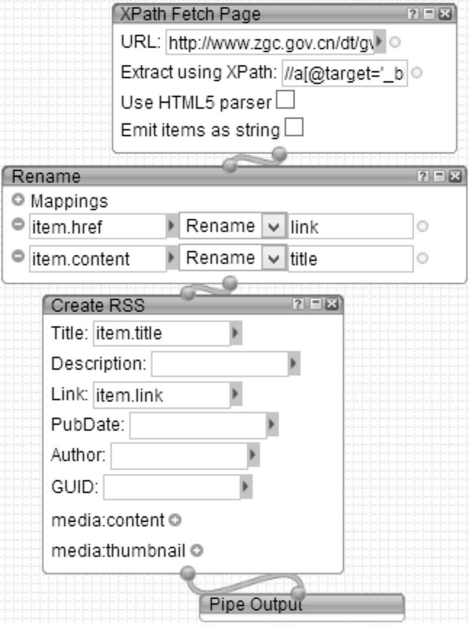 根据面向科研协同的跨系统技术创新信息服务融合平台框架,服务融合组织实现可利用Yahoo! Pipes工具来操作,即利用Pipes手段实现页面、网络服务和RSS Feeds等的融合,以创建Web应用并与其他用户进行分享[17]。