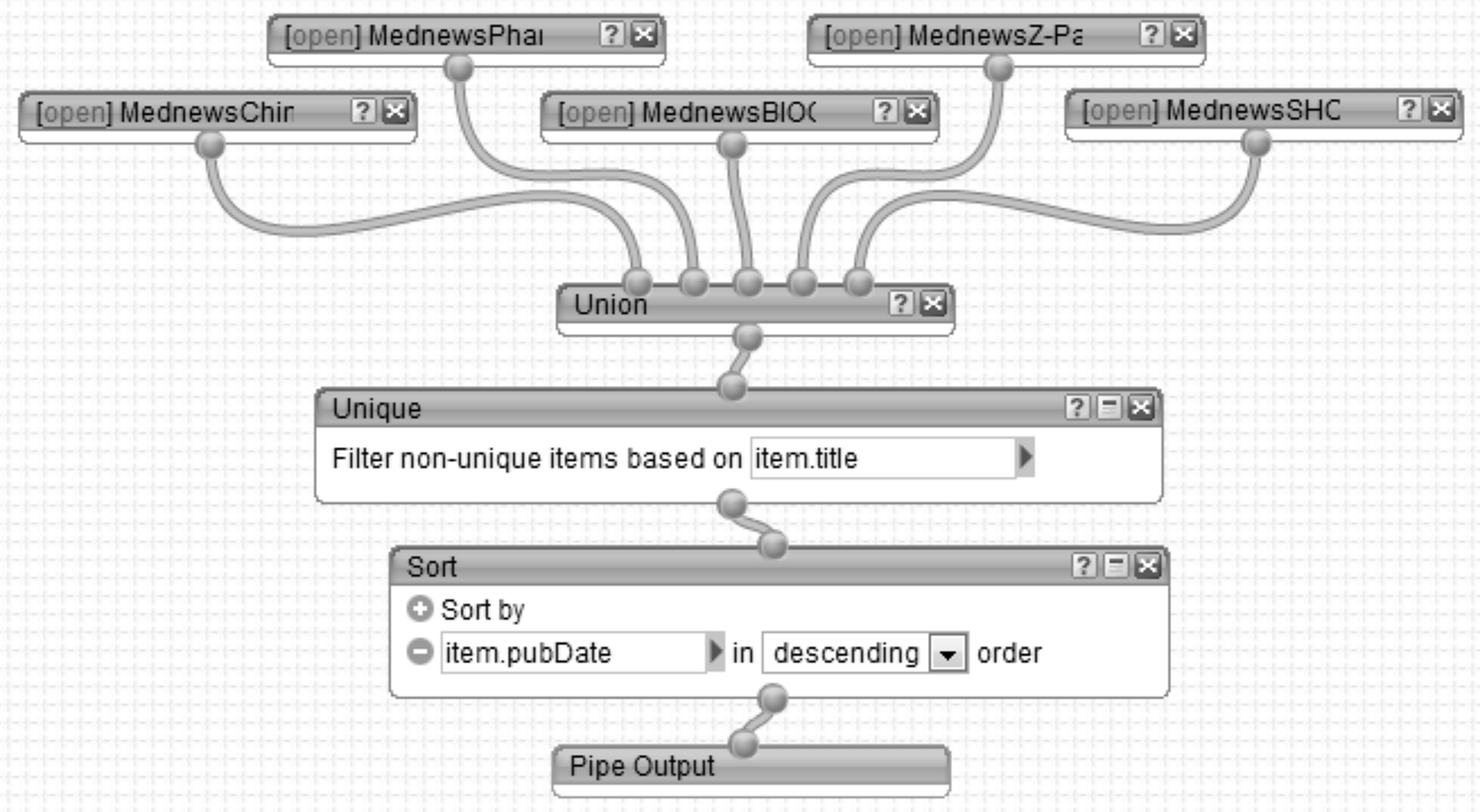 以技术创新相关资讯RSS feed构建为基础,在实现分类整合过程中,根据资讯类别,实现相同类别的跨系统信息资源以多源RSS feed形式提供,并利用Union模块将其融合在一起,如图5所示。Union模块融合了中国生物医药产业门户、医药网、生物谷、中关村、上海生物医药科技产业促进中心等网站发布的生物医药产业动态新闻,并利用Unique模块对新闻标题进行唯一性筛选处理,再利用Sort模块对新闻按发布时间先后进行逆序排序,最终实现平台对多源资讯新闻的分类和排序展示,以适应不同领域用户技术创新信息需求。
