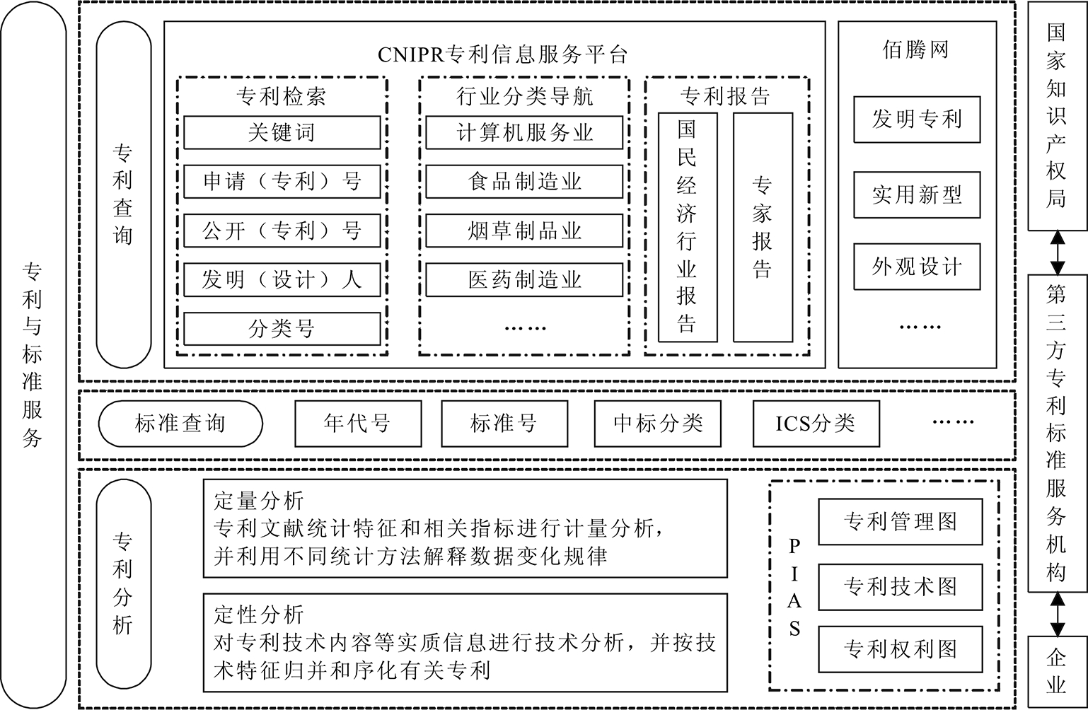 (1)专利与标准查询。在专利信息检索方面,CNIPR专利信息服务平台提供了对中外专利的混合检索、行业分类导航检索、IPC分类导航检索、中国专利法律状态检索等服务[13]。同时,如江苏省重点科技中介服务机构佰腾网等其它第三方专利信息服务机构亦可作为专利查询的补充,进一步实现按实用新型、外观设计等类型对专利进行分类检索并获取全文资源[14]。而在标准查询方面,可利用国家标准查询网,也可综合利用佰腾网标准查询系统,按标准年代、适用范围、中标分类等实现对产业集群技术创新相关技术标准的查询。