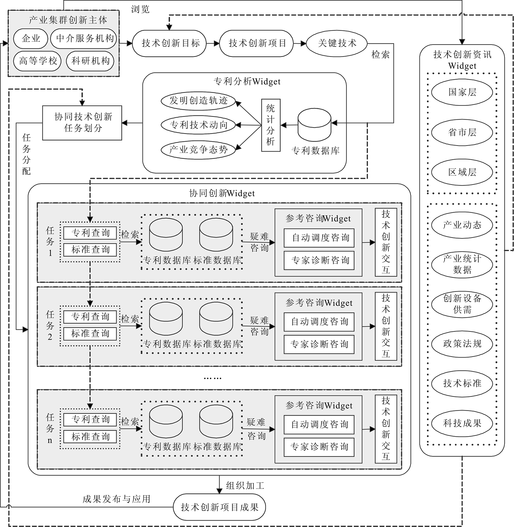 依据专利分析结果,产业集群技术创新目标得以进一步明确。结合技术创新资讯中相关技术政策法规、技术标准与现有科技成果信息,基于平台将产业集群技术创新目标进行任务分解,技术创新任务由具体技术环节或细分技术进行界定,每个任务由单个或多个创新主体承担,并通过协同创新方式开展具体技术创新活动,以完成相应的技术创新任务。