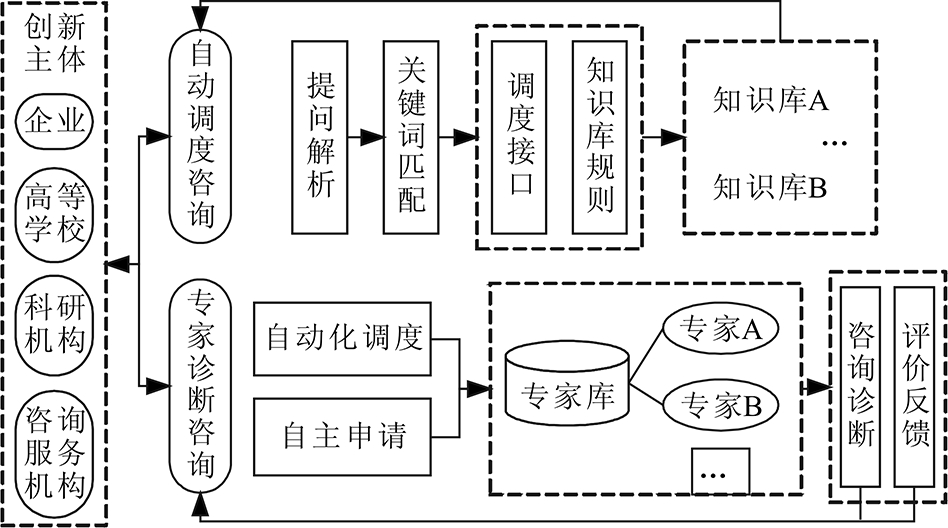 (2)专家诊断咨询。专家诊断咨询用于需依据用户提问情境进行处理和分析的具体问题。在科研协同技术创新活动中,对于技术创新面临的疑难问题和创新技术选择与使用方式等,在面向技术创新专家诊断咨询中,可通过解析用户咨询技术领域而为其分配相应专家,亦可由用户进行专家诊断咨询的自主申请。用户在完成了专家诊断咨询后,还可根据技术创新实际情况进行评价反馈,并形成知识库,供具有类似技术创新需求的科研协同主体参考。