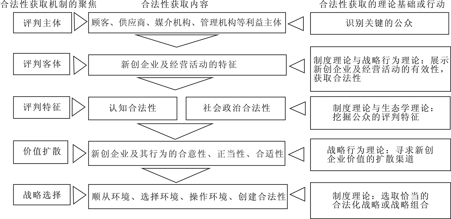 三种理论解释的不同点主要体现在:①从研究的控制点(Locus of control)看,以公众为中心的制度理论和生态学理论认为,是公众而非新创企业的代表支配着新创企业的合法性进程,而行为者为中心的战略理论则强调新创企业的代表(如创业者)控制着合法性进程,注重战略行动对新创企业合法性的作用;②从研究层面看,获取合法性的研究层面在三种理论下也有所差异。在合法性获取的影响方面,微观层面分析更关注个体(如新创企业的代表)的行动作用,宏观层面分析更注重制度、行业、市场等外在环境的作用[6]。由此,战略理论侧重于个体在寻求合法性中的作用,而制度理论与生态学理论侧重于宏观层面的因素,认为是环境决定了新创企业的合法性;③从合法性分析维度看,不同理论的侧重点有所差异。制度理论结合了认知维度与评判维度,既考虑了公众基于价值观、信仰等认知合法性的因素,也考虑到权威机构、组织等因素对合法性评判的重要作用;战略理论更偏向于评判维度,试图揭示新创企业如何实现评判方面的合法性;生态学理论更偏重于认知维度,强调新创企业合法性取决于公众的理解程度,即公众对新创企业的理解越深,其合法性程度就越高。