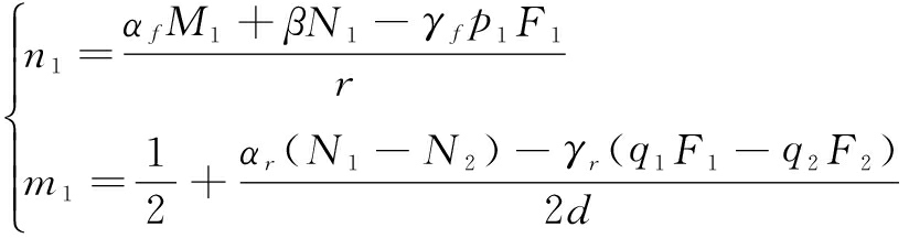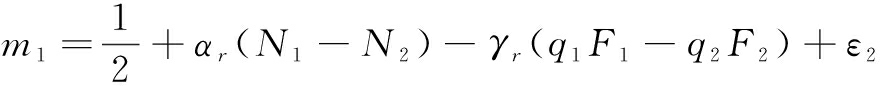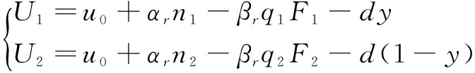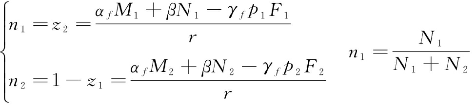 其中,v0表示支持者投资项目的固有期望效用,u0表示发起者发起项目的固有期望效用;N和M分别表示平台i(i=1,2)上的支持者数量和发起者数量;p和q分别表示平台i对支持者和发起者制定的交易费率;F表示项目筹资金额;系数γf、γr分别表示平台定价对支持者和发起者效用的影响程度;αf表示发起者对于支持者的交叉网络外部性强度,即支持者从单位发起者处获取的效用;αr表示支持者对于发起者的交叉网络外部性强度,即发起者从单位支持者处获取的效用;β表示投资者之间存在的自网络外部性。
