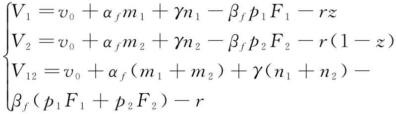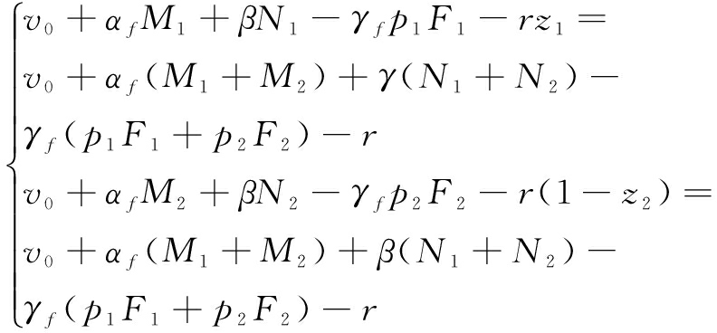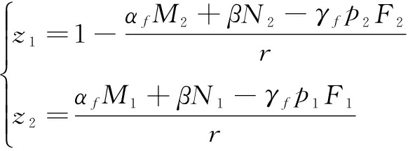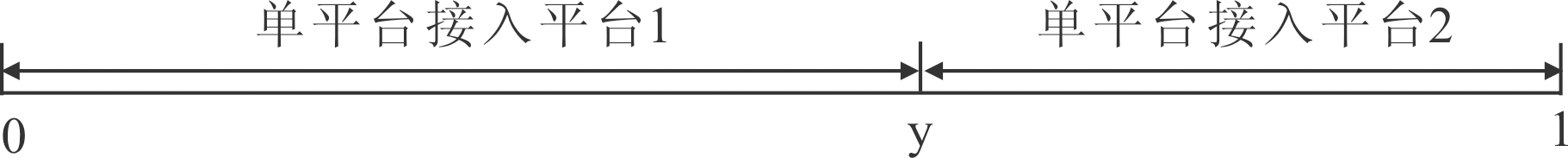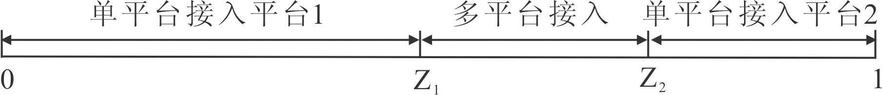 在图2中,z1、z2为效用无差异点,即在点z1处的支持者多归属和在平台1上单归属获取的效用相同。同理,在点z2处的支持者多归属和在平台2上单归属获取的效用相同。由此,则支持者在z1、z2处满足的关系见式(4)。同理,在图3中y为效用无差异点,即在点y处的发起者在平台1上单归属获取的效用与其在平台2上单归属获取的效用相同。则发起者在y处满足的关系见式(5)。