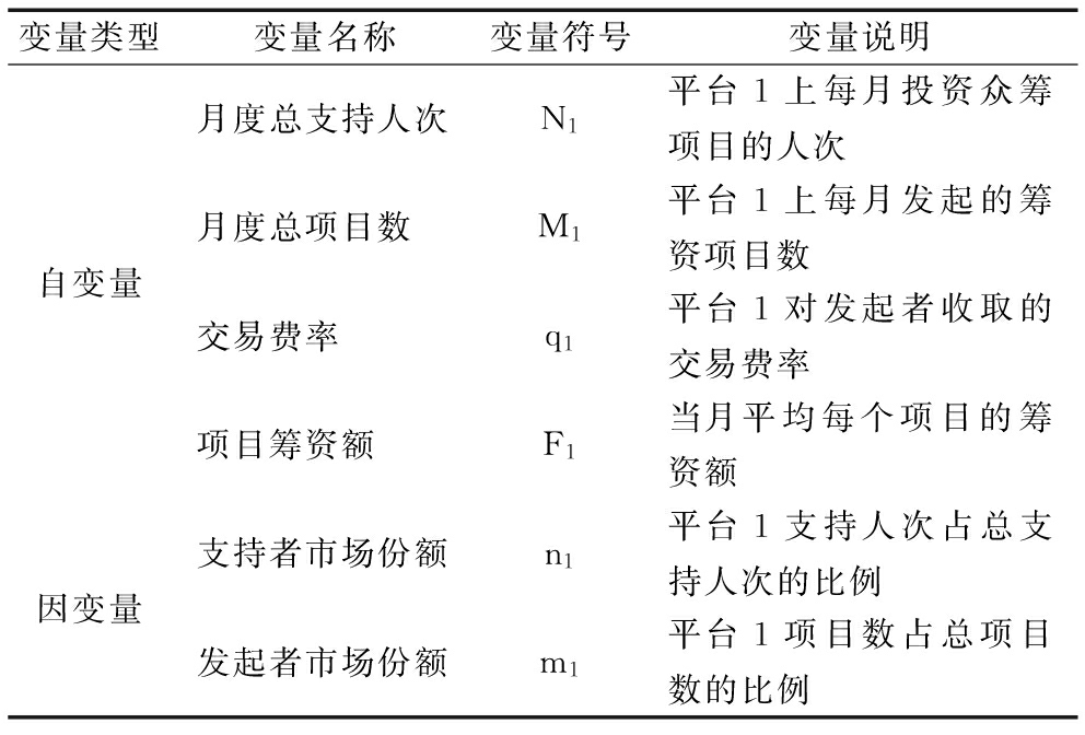 变量类型变量名称变量符号变量说明月度总支持人次N1平台1上每月投资众筹项目的人次自变量月度总项目数M1平台1上每月发起的筹资项目数交易费率q1平台1对发起者收取的交易费率项目筹资额F1当月平均每个项目的筹资额因变量支持者市场份额n1平台1支持人次占总支持人次的比例发起者市场份额m1平台1项目数占总项目数的比例