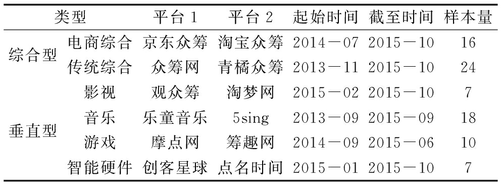 类型平台1平台2起始时间截至时间样本量综合型电商综合京东众筹淘宝众筹2014-072015-1016传统综合众筹网青橘众筹2013-112015-1024影视观众筹淘梦网2015-022015-107垂直型音乐乐童音乐5sing2013-092015-0918游戏摩点网筹趣网2014-092015-0610智能硬件创客星球点名时间2015-012015-107