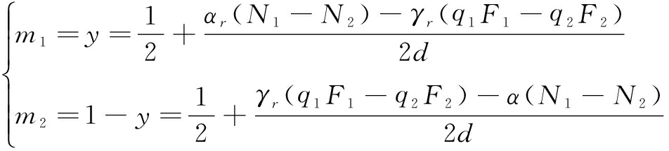 则平台i(i=1,2)获取的发起者所占市场份额mi(i=1,2)为: