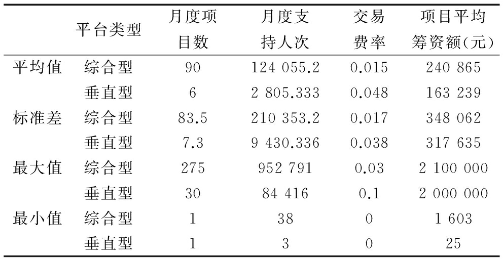 平台类型月度项目数月度支持人次交易费率项目平均筹资额(元)平均值综合型90124055.20.015240865垂直型62805.3330.048163239标准差综合型83.5210353.20.017348062垂直型7.39430.3360.038317635最大值综合型2759527910.032100000垂直型30844160.12000000最小值综合型13801603垂直型13025