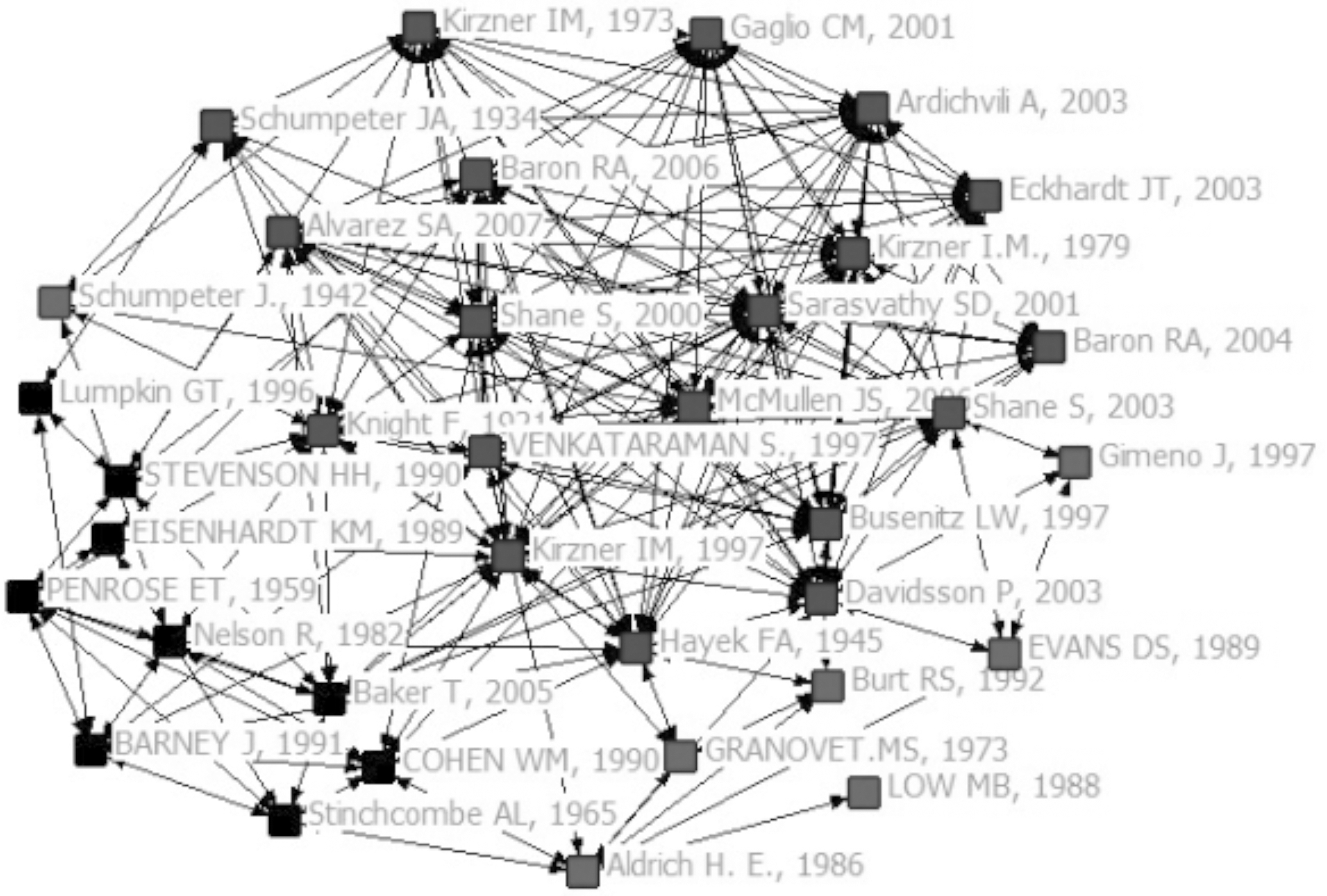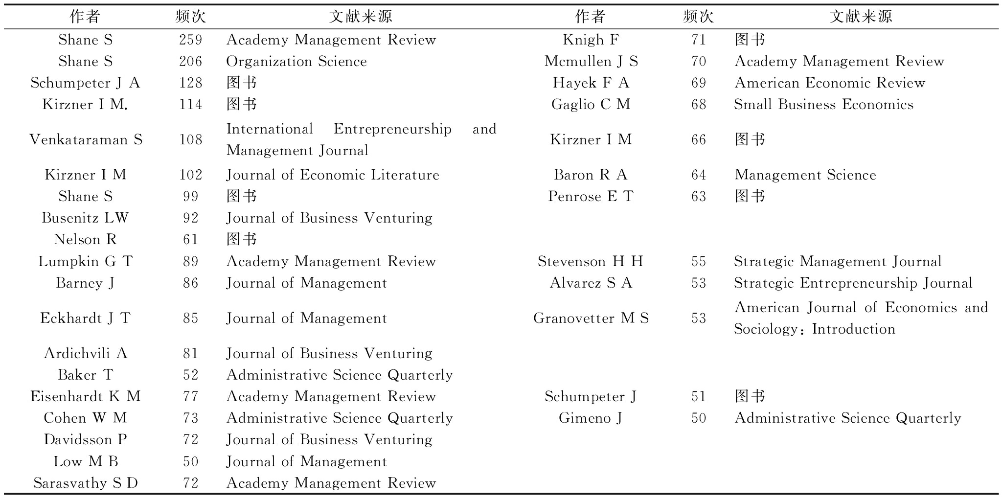 作者频次文献来源作者频次文献来源ShaneS259AcademyManagementReviewKnighF71图书ShaneS206OrganizationScienceMcmullenJS70AcademyManagementReviewSchumpeterJA128图书HayekFA69AmericanEconomicReviewKirznerIM.114图书GaglioCM68SmallBusinessEconomicsVenkataramanS108InternationalEntrepreneurshipandManagementJournalKirznerIM66图书KirznerIM102JournalofEconomicLiteratureBaronRA64ManagementScienceShaneS99图书PenroseET63图书BusenitzLW92JournalofBusinessVenturingNelsonR61图书LumpkinGT89AcademyManagementReviewStevensonHH55StrategicManagementJournalBarneyJ86JournalofManagementAlvarezSA53StrategicEntrepreneurshipJournalEckhardtJT85JournalofManagementGranovetterMS53AmericanJournalofEconomicsandSociology:IntroductionArdichviliA81JournalofBusinessVenturingBakerT52AdministrativeScienceQuarterlyEisenhardtKM77AcademyManagementReviewSchumpeterJ51图书CohenWM73AdministrativeScienceQuarterlyGimenoJ50AdministrativeScienceQuarterlyDavidssonP72JournalofBusinessVenturingLowMB50JournalofManagementSarasvathySD72AcademyManagementReview