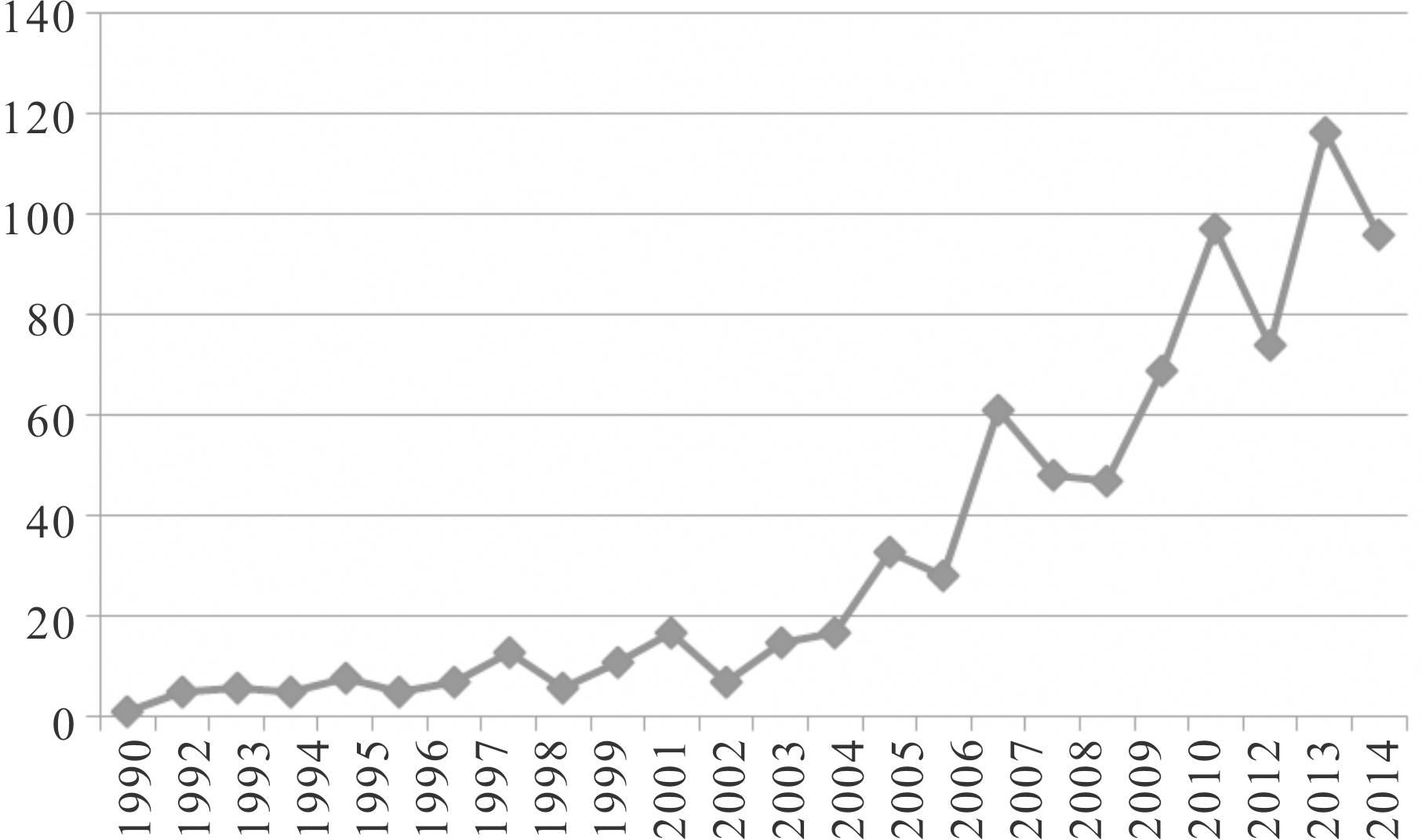 图1 1990-2014年创业机会文献发表数量趋势