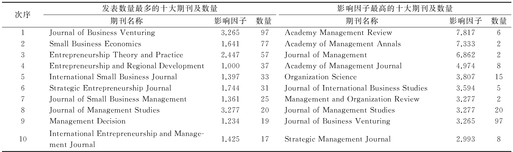 次序发表数量最多的十大期刊及数量期刊名称影响因子数量影响因子最高的十大期刊及数量期刊名称影响因子数量1JournalofBusinessVenturing3.26597AcademyManagementReview7.81762SmallBusinessEconomics1.64177AcademyofManagementAnnals7.33323EntrepreneurshipTheoryandPractice2.44757JournalofManagement6.86224EntrepreneurshipandRegionalDevelopment1.00037AcademyofManagementJournal4.97485InternationalSmallBusinessJournal1.39733OrganizationScience3.807156StrategicEntrepreneurshipJournal1.74431JournalofInternationalBusinessStudies3.59457JournalofSmallBusinessManagement1.36125ManagementandOrganizationReview3.27728JournalofManagementStudies3.27720JournalofManagementStudies3.277209ManagementDecision1.23419JournalofBusinessVenturing3.2659710InternationalEntrepreneurshipandManage-mentJournal1.42517StrategicManagementJournal2.9938