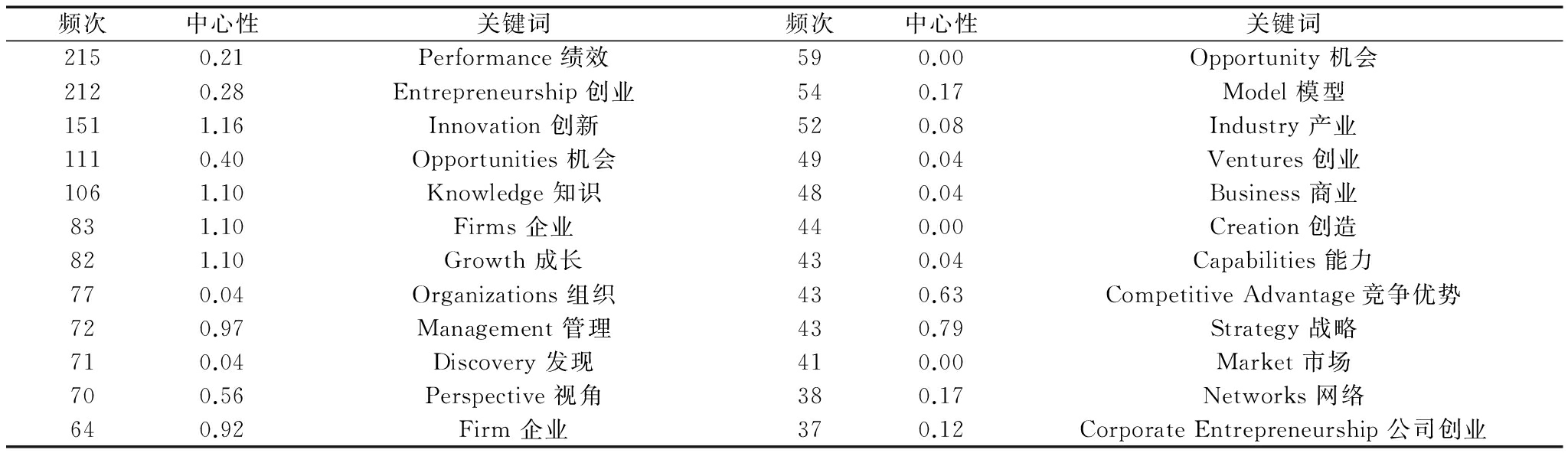 文章中的高频关键词集中体现了该领域学者共同关注的研究主题。本文利用Bibexcel软件对数据池文献进行关键词分析。792篇文献共有98个关键词,这些关键词一共出现4 048次。关键词共词分析如表3所示,出现30次以上的关键词有42个。其中,频次表示一个关键词在数据池文献中出现的次数;中介中心性表示一个关键词充当其它不直接联结关键词的中介作用大小,中心性越高,中介作用越明显。关于高频关键词的共线特征,创新、机会、创业者、机会识别排名前列。紧随其后的是创业家、国际创业、社会资本、社会创业及知识。从整体来看,792篇文献内容丰富,然而创业、机会、机会识别仍是创业机会研究的重点,出现频次较高,同时社会资本、知识等因素可能对创业机会产生影响,因此,后者出现频次紧随其后。