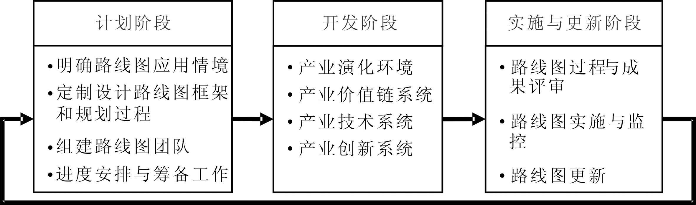产业技术路线图绘制完成后,可以在路线图发起人的协调下,联合产业中的利益相关者对路线图的可行性进行评审,并制定产业技术路线图实施计划,保证产业关键技术研发等顺利进行。最后,随着时间的推进,产业环境和产业技术等都会发生变化,需要按照一定周期对产业技术路线图进行更新,以适应产业不断变化的形势。