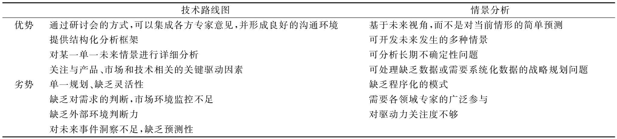 情景分析通过识别系统中的关键驱动因素以及相关联系,并经过详细的推理,探究未来事件可能的不同发展路径[15,16]。在动态不稳定环境下,可将情景分析的预见性、灵活性和环境监控等优势,与技术路线图设计过程内在的清晰性、完整性和关注细节等优势相融合,如Strauss和Radnor[7]于2004年提出的融合技术路线图和情景分析的多情景技术路线图方法。其中,技术路线图和情景分析角色的互补性如表1所示。基于两种方法的优劣势,Lizaso和Reger[17]提出了基于情景分析的技术路线图制定过程,包括情景分析技术路线图的准备、分析和绘制;Saritas和Aylen[18]对情景分析和技术路线图方法的互补性进行了论述,并基于清洁产品的案例研究,分别讨论了情景分析在技术路线图前期、中期和后期的不同作用。