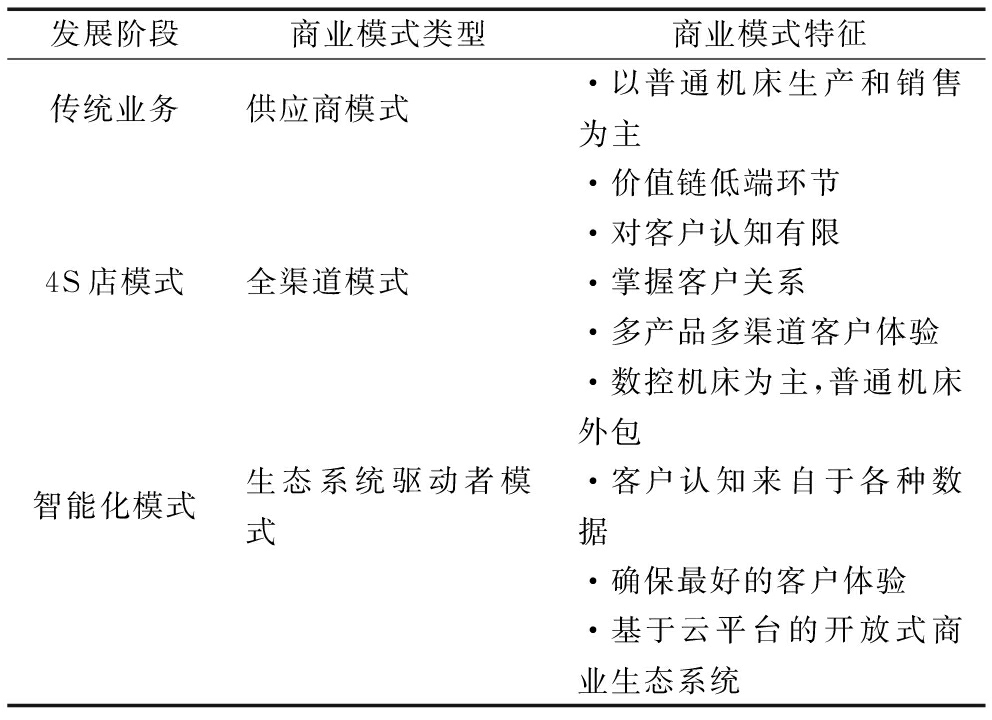 发展阶段商业模式类型商业模式特征传统业务供应商模式·以普通机床生产和销售为主·价值链低端环节·对客户认知有限4S店模式全渠道模式·掌握客户关系·多产品多渠道客户体验·数控机床为主,普通机床外包智能化模式生态系统驱动者模式·客户认知来自于各种数据·确保最好的客户体验·基于云平台的开放式商业生态系统