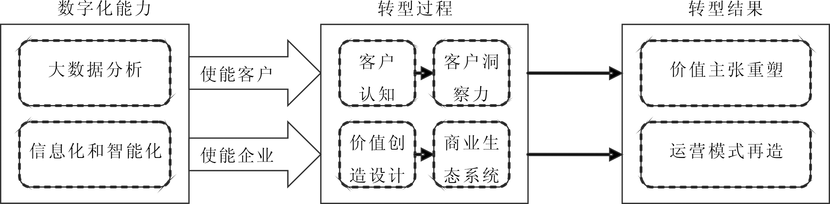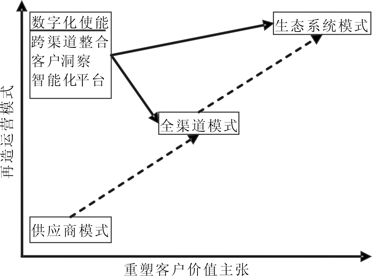 其次,在数字化使能的商业模式转型过程中,体现出数字化分别使能客户和企业。一方面,商业数字化使能企业获取了大量客户信息,通过大数据分析提升了客户认知,进而提高了企业对客户的洞察力。其结果是,客户价值主张被重塑。另一方面,信息化和智能化使能企业价值创造平台得到了变革。面向商业价值创造和分配,内部相关联的企业构成了复杂价值网络,组织则通过参与整个商业生态系统而实现价值。其结果是,企业运营模式得到再造。