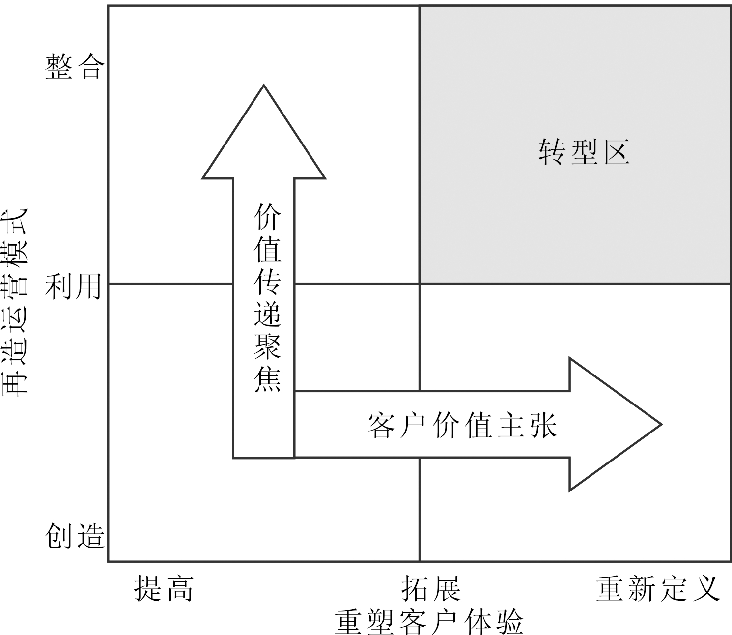 (2)数字化时代的商业模式转型路径,是企业价值主张重塑和运营模式再造并行的过程。数据化时代的商业模式转型路径,与企业的战略目标、行业环境、竞争压力和客户期望有关[9]。转型路径的区别更多体现在客户价值主张和运营模式再造程度的不同,但一定是二者合力作用的结果。单一的某一维度的再造,是不能实现商业模式成功转型的。