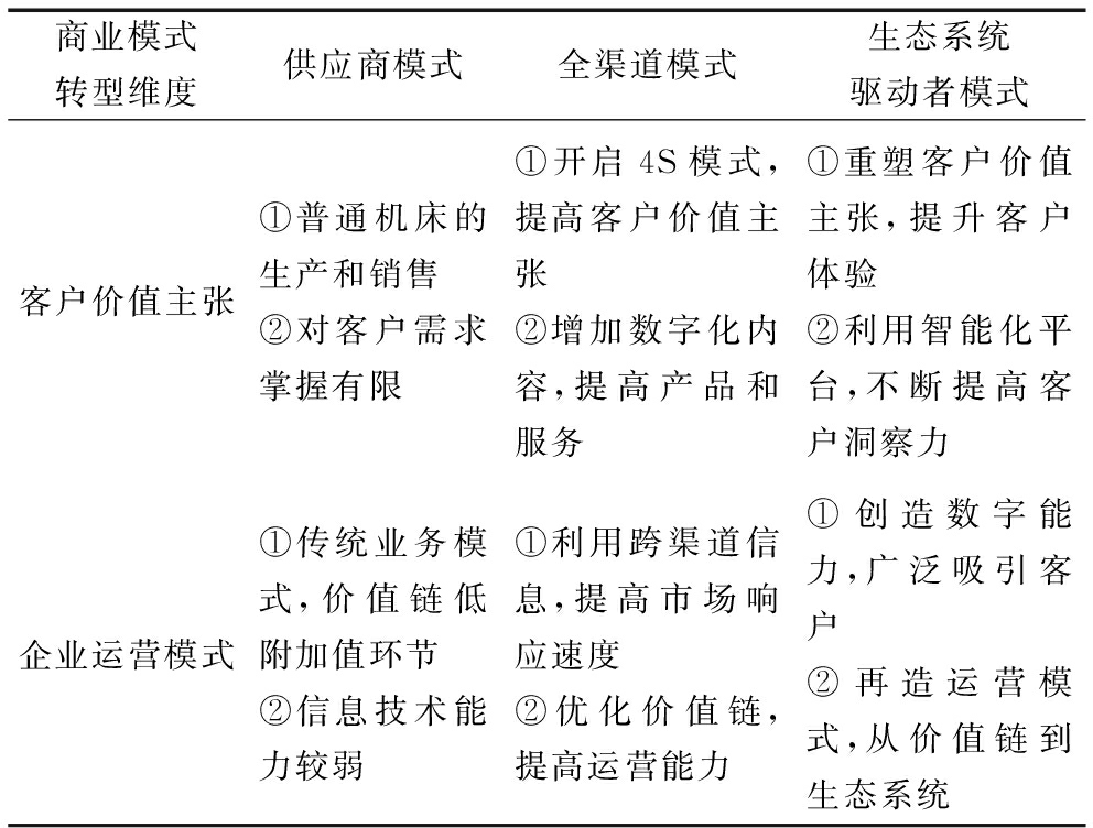 参考图1的数字化时代商业模式转型路径,本文将从数字化使能的客户价值主张和运营模式两个维度,分析沈阳机床商业模式的转型过程(见表2)。