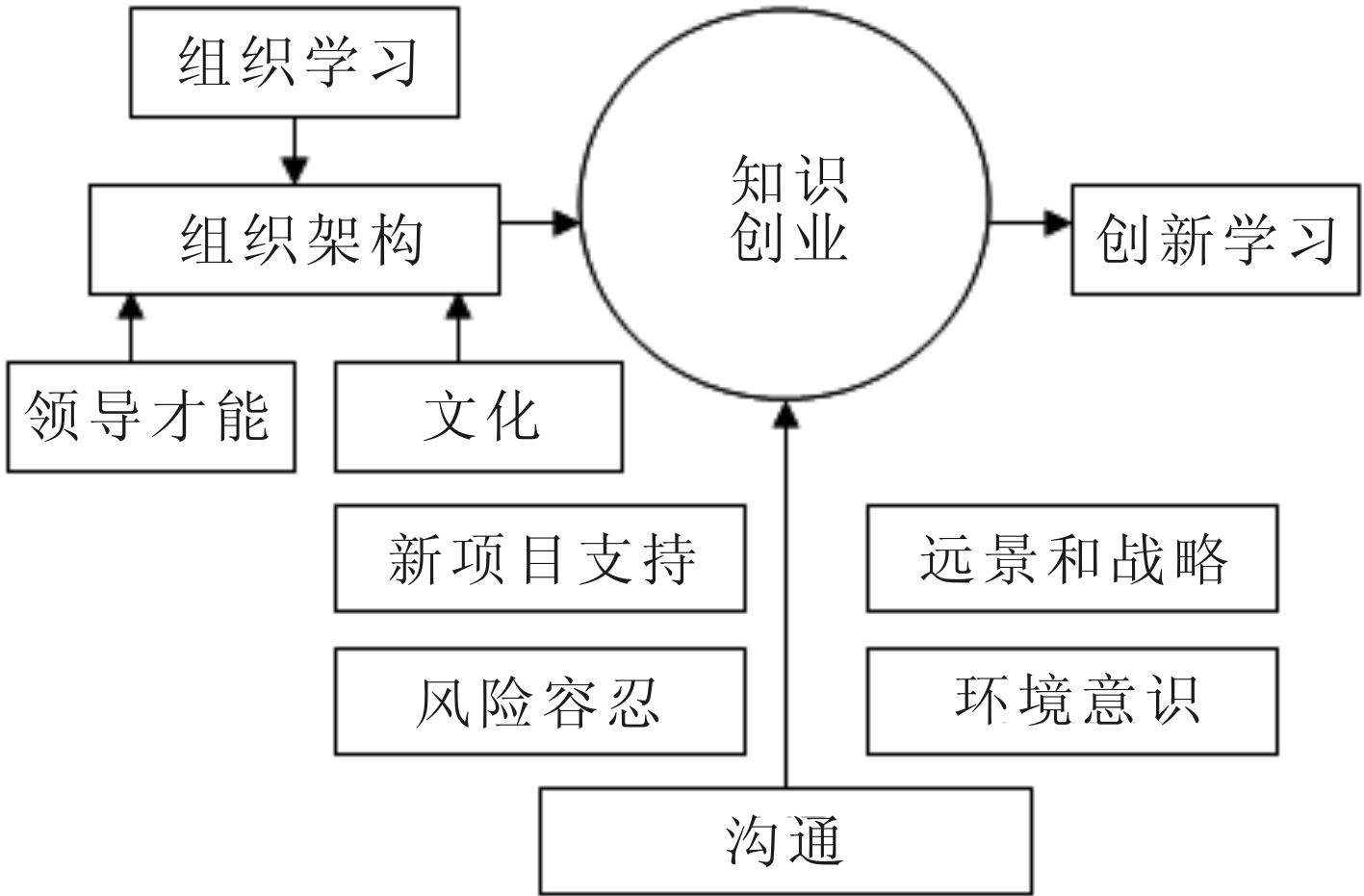 知识创业是对上述传统创业的延伸和发展,是创业实践顺应新经济发展趋势的必然产物。传统创业主要依赖于土地、资本、劳动力等要素,而知识创业更依赖于知识要素。Senges[12]指出,知识创业不同于传统的资本创业,它注重识别或把握机会以及提高知识的创造与产出,而非最大限度地增加货币利润。其核心为知识生产,描述的是识别并应用知识和其它发明的能力将会给知识生产(科研和教学)带来更高绩效。Mcdonald[13]则基于组织学习与创新视角,提出了知识创业的5大维度,即环境意识、勤于思考、新项目支持、风险容忍度和沟通。在此基础上,Jusoh[14]融入了自己对组织条件和知识创业的见解,构建了知识创业模型(见图1),并指出,知识创业具有提高组织创造力和间接提高组织绩效的作用。另外,从企业家创业视角出发, Leadbeater 和 Oakley[15]认为,企业家是以知识工作为基础开创事业的。作为一名知识型企业家,必须具备充足的知识资本来实现价值和财富的创造[16]。国内学者林钧敬[17]认为,创业是个人与社会相结合的一种新形式,知识创业是将知识和资金直接融合形成一种生产力,并产生新的企业。从创造价值的过程出发,知识创业具有领导创新的核心含义[18]。刘沁玲[19]较为系统地阐述了知识创业的概念:以知识创新、生产为主要特征,依靠知识、技术开创新事业,实现其潜在价值的过程,它是集知识企业创办(或开展新业务)、知识创新、知识生产、知识资本化等于一体的创业活动过程。综上所述,知识创业具有知识主导、风险认同和倚重人力资本3大特点,其创业主体(企业家、学者、知识型企业等)能够识别市场机会和承担风险,并善于利用知识要素的价值功能开创新事业或拓展新业务,是一种新型创业模式。
