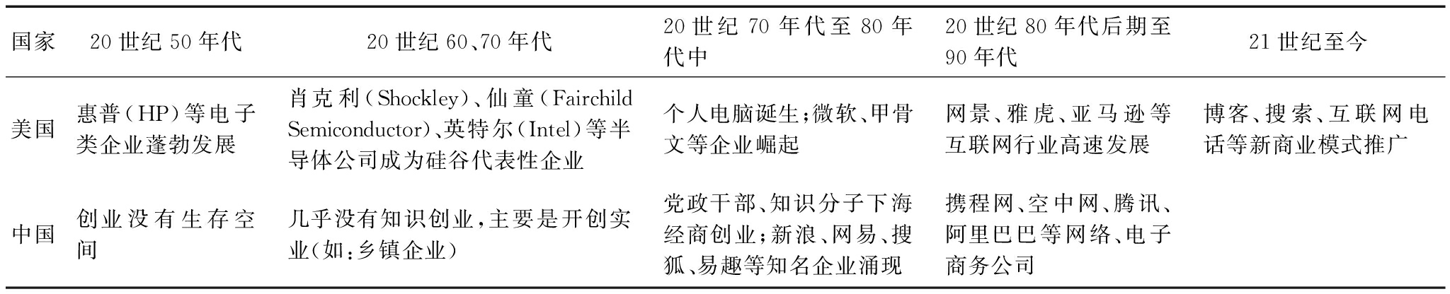 国家20世纪50年代20世纪60、70年代20世纪70年代至80年代中20世纪80年代后期至90年代 21世纪至今美国惠普(HP)等电子类企业蓬勃发展肖克利(Shockley)、仙童(FairchildSemiconductor)、英特尔(Intel)等半导体公司成为硅谷代表性企业个人电脑诞生;微软、甲骨文等企业崛起网景、雅虎、亚马逊等互联网行业高速发展博客、搜索、互联网电话等新商业模式推广中国创业没有生存空间几乎没有知识创业,主要是开创实业(如:乡镇企业)党政干部、知识分子下海经商创业;新浪、网易、搜狐、易趣等知名企业涌现携程网、空中网、腾讯、阿里巴巴等网络、电子商务公司