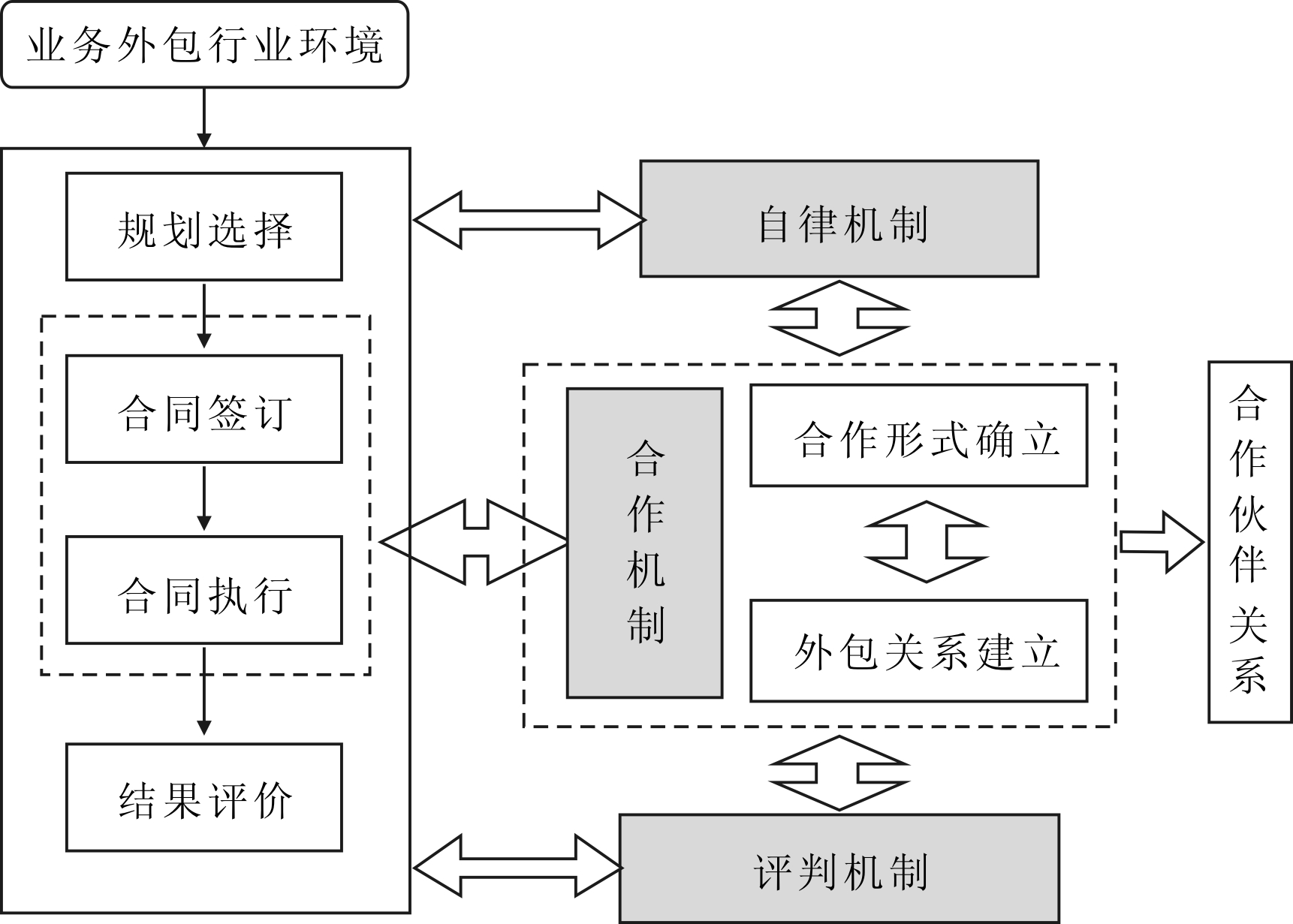 依据业务外包开发阶段划分,建立包含自律、合作、评判三大机制的业务外包风险规避模型,如图1所示,并设计每个机制在业务外包各阶段的风险规避功能。