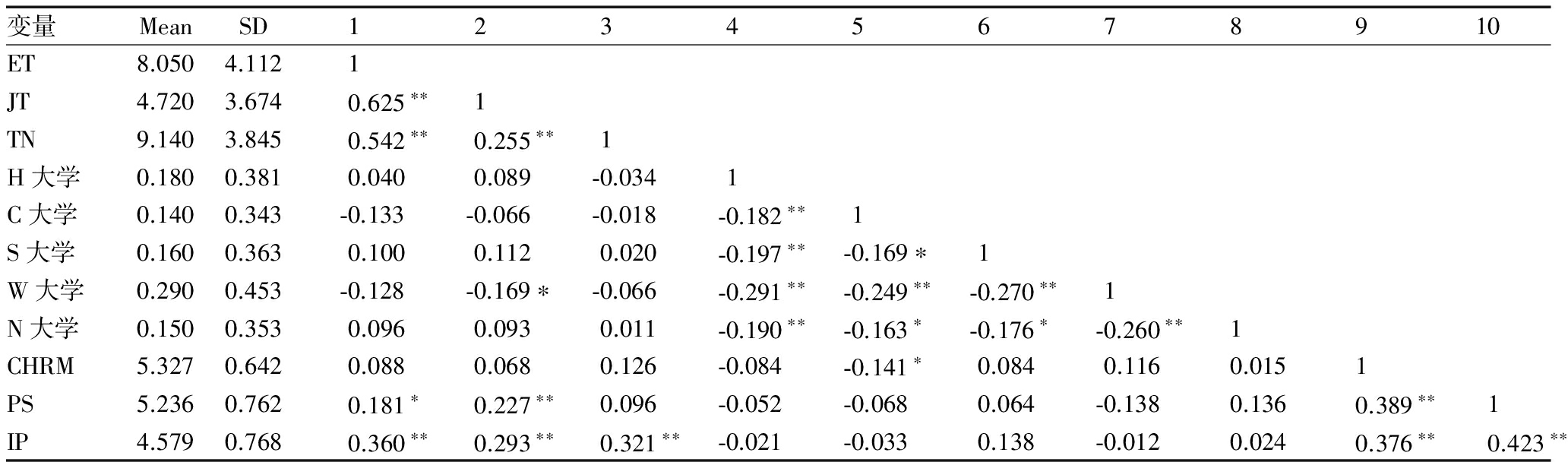 注:①ET表示团队成立时间,JT表示平均加入团队时间,TN表示团队人数,UNI表示学校名称,CHRM表示集体主义人力资源实践, PS表示团队心理安全氛围,IP表示团队创新绩效;②*表示P<0.05,**表示P<0.01(双尾检验)