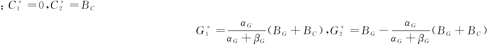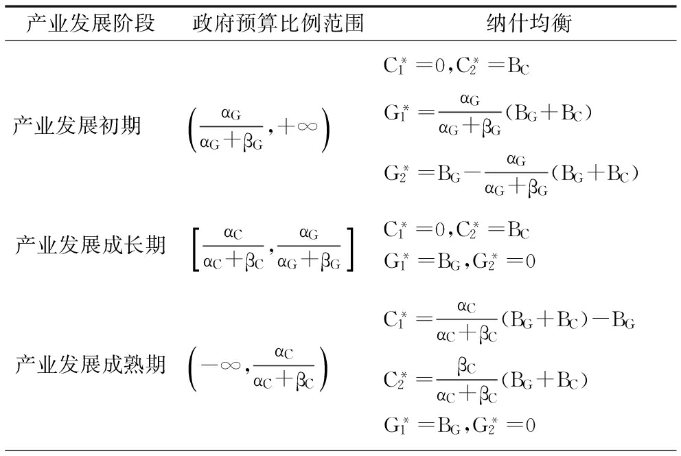 产业发展阶段政府预算比例范围纳什均衡产业发展初期 αGαG+βG,+∞()C*1=0,C*2=BCG*1=αGαG+βG(BG+BC)G*2=BG-αGαG+βG(BG+BC)产业发展成长期αCαC+βC,αGαG+βG[]C*1=0,C*2=BCG*1=BG,G*2=0产业发展成熟期-∞,αCαC+βC()C*1=αCαC+βC(BG+BC)-BGC*2=βCαC+βC(BG+BC)G*1=BG,G*2=0