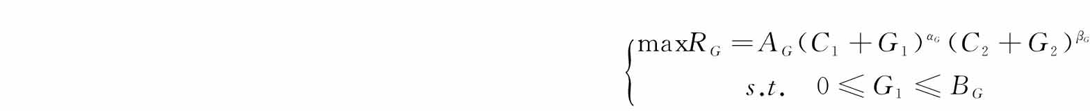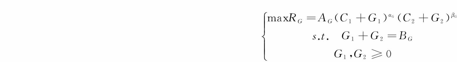 对于CD生产函数投资博弈模型求解,政府面临的问题是:对于给定的企业预研投资水平C1和研发投资水平C2,政府在投资预算约束BG下选择预研项目投资水平G1和立项项目投资水平G2,即求解最优化问题: