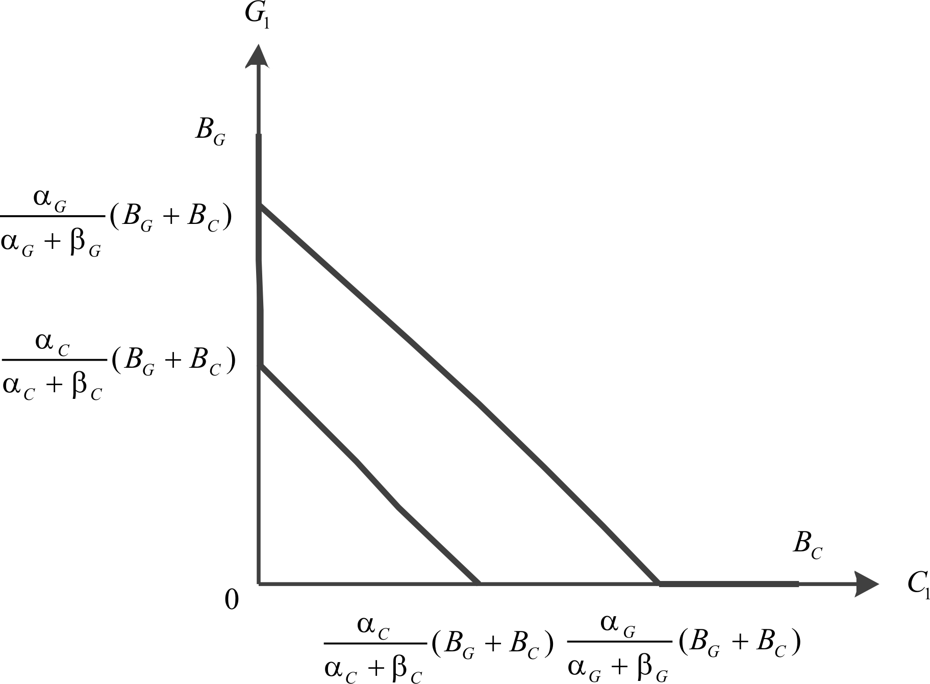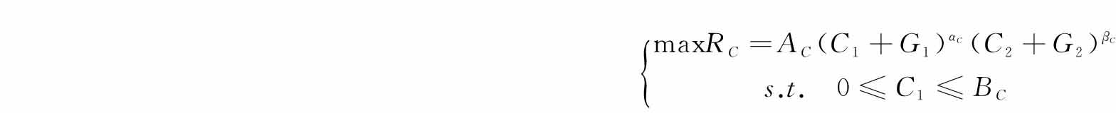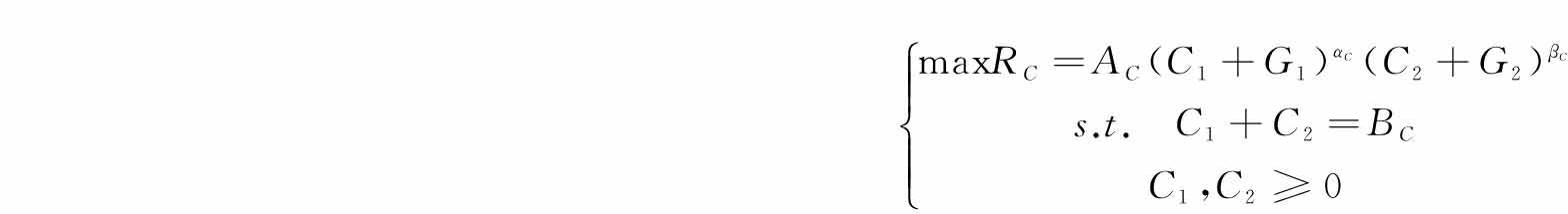 企业面临的问题是:对于给定的政府投资选择G1、G2,企业在其投资预算约束BC下选择C1、C2,即求解最优化问题: