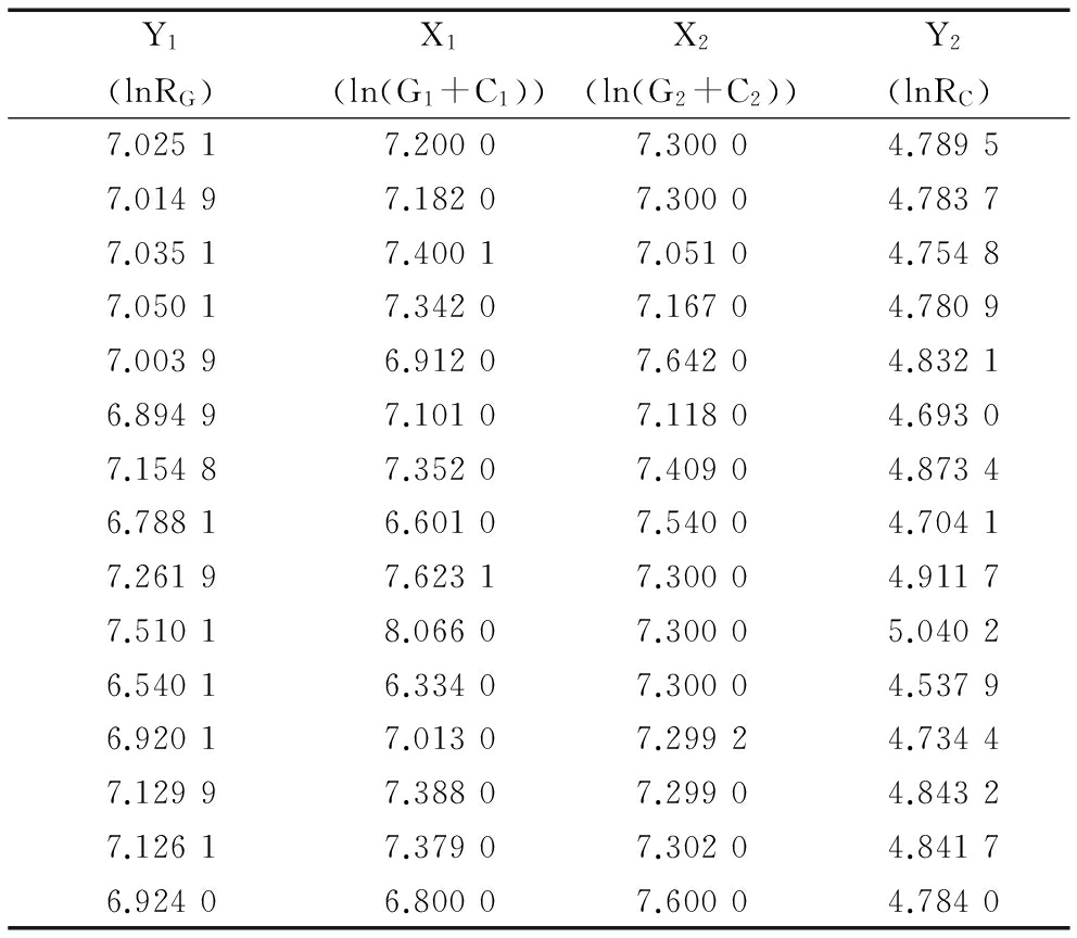 Y1(lnRG)X1(ln(G1+C1))X2(ln(G2+C2))Y2(lnRC)7.02517.20007.30004.78957.01497.18207.30004.78377.03517.40017.05104.75487.05017.34207.16704.78097.00396.91207.64204.83216.89497.10107.11804.69307.15487.35207.40904.87346.78816.60107.54004.70417.26197.62317.30004.91177.51018.06607.30005.04026.54016.33407.30004.53796.92017.01307.29924.73447.12997.38807.29904.84327.12617.37907.30204.84176.92406.80007.60004.7840