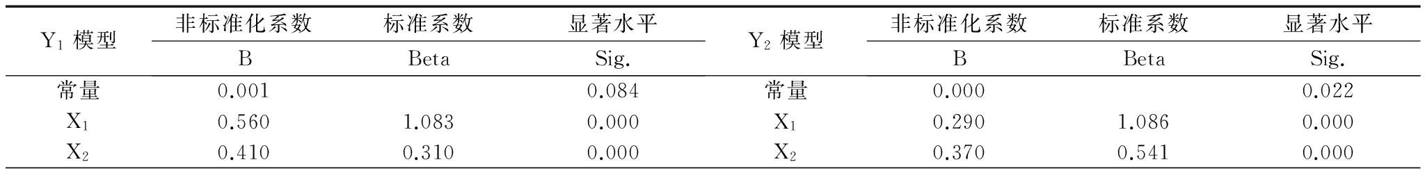 Y1模型非标准化系数标准系数显著水平BBetaSig.Y2模型非标准化系数标准系数显著水平BBetaSig.常量0.0010.084常量0.0000.022X10.5601.0830.000X10.2901.0860.000X20.4100.3100.000X20.3700.5410.000