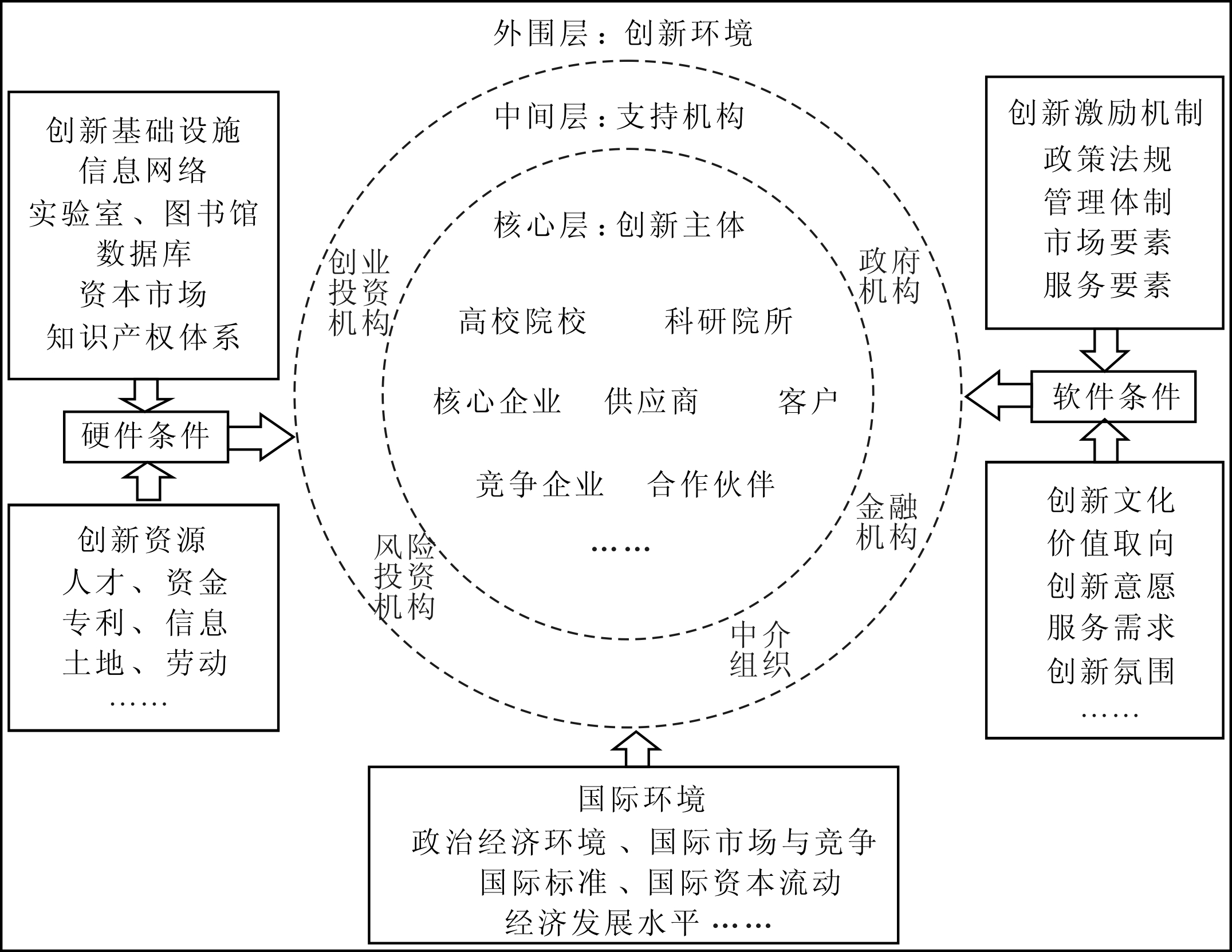 创新生态系统类似于自然生态系统,由创新生态群落和创新生态内外部环境共同构成,其包括硬件条件、软件条件、产业体系、人才和外部环境5个要素[17]。科技服务业创新生态系统可划分为核心层、中间层和外围层3个层面,具体如图1所示。从中可见,核心层由创新主体构成,包括高校、科研院所、客户、利益相关企业等;中间层由支持机构组成,包括政府机构、中介组织、金融机构、风险投资机构、创新创业机构等;外围层即创新环境层,由创新基础设施、创新资源等硬条件,创新文化、创新激励机制等软条件以及国际环境等要素构成[18]。