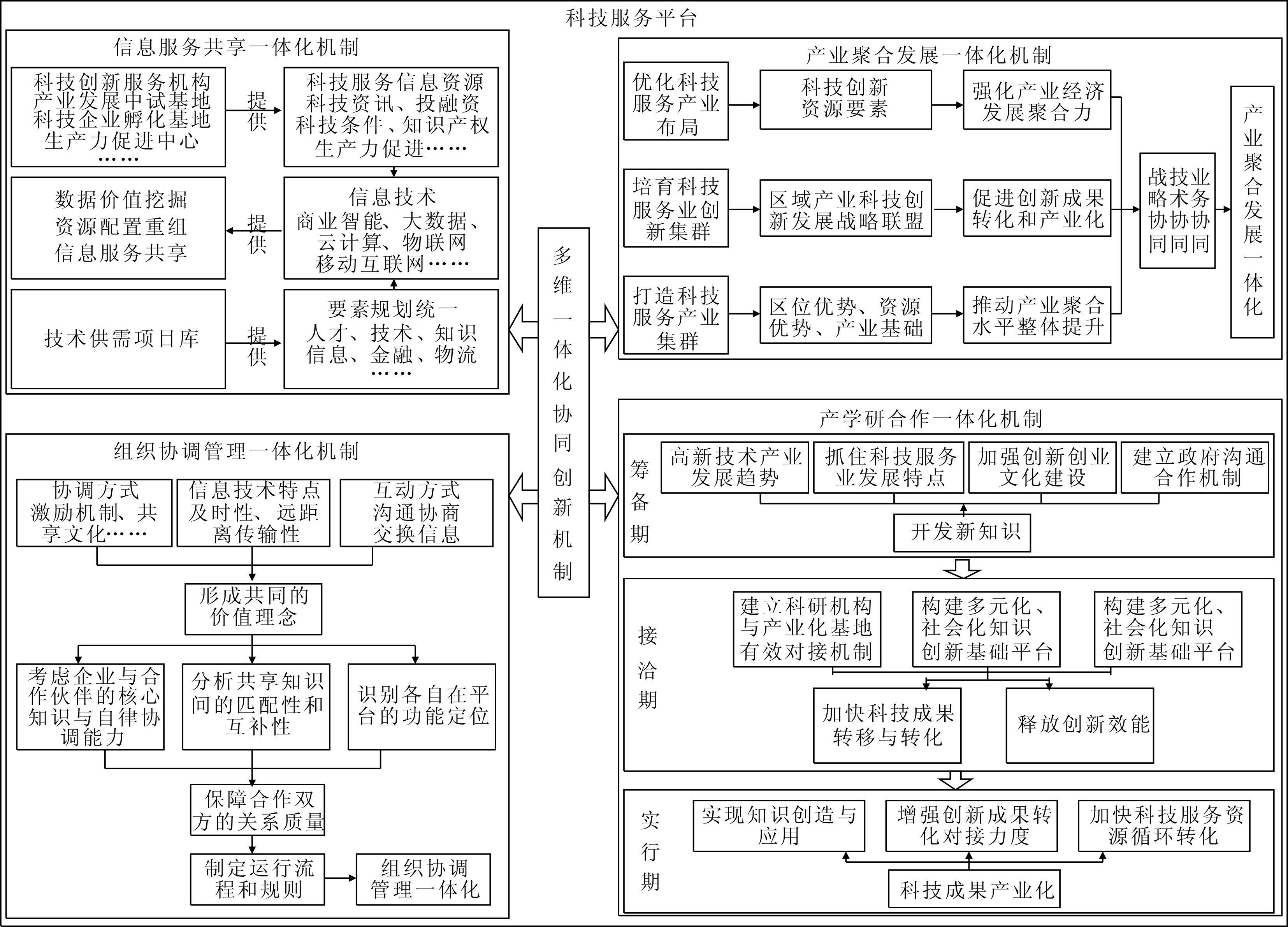 科技服务平台上各创新要素之间、创新要素与系统之间、系统与环境之间通过信息服务共享一体化,为科技服务业创新生态系统价值共创持续提供创新资源;通过产业聚合发展一体化,为科技服务业创新生态系统价值共创奠定稳定基础;通过组织协调管理一体化,为科技服务业创新生态系统价值共创构建和谐发展的创新环境;通过产学研合作一体化,为科技服务业创新生态系统价值共创提供不竭动力。上述4个方面构成了完整的多维一体化协同创新机制,如图3所示。