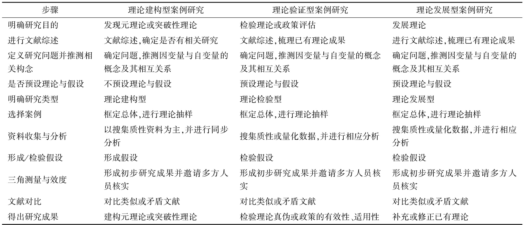 案例研究是理论创新的方法与工具。具体案例研究类型可与以上理论创新的3种类型相对应,也可根据研究目的或研究阶段将案例研究划分为理论建构型、理论检验型、理论发展型3种案例研究类型[20],并形成3种研究路径。假定研究者已经初步了解所研究问题与研究目的,基于上述案例研究分歧,借鉴Eisenhardt[1]、Stake[9]、Yin[8]、唐权[11]等研究成果,为每种案例研究类型归纳出11个研究步骤,具体包括明确研究目的、进行文献综述、明确研究问题并推测相关构念、(不)预设理论与假设、明确研究类型、确定案例总体并选择典型案例、资料收集与分析、形成/检验理论与假设、三角测量与效度检验、进行文献对比、形成研究成果,如表1所示。