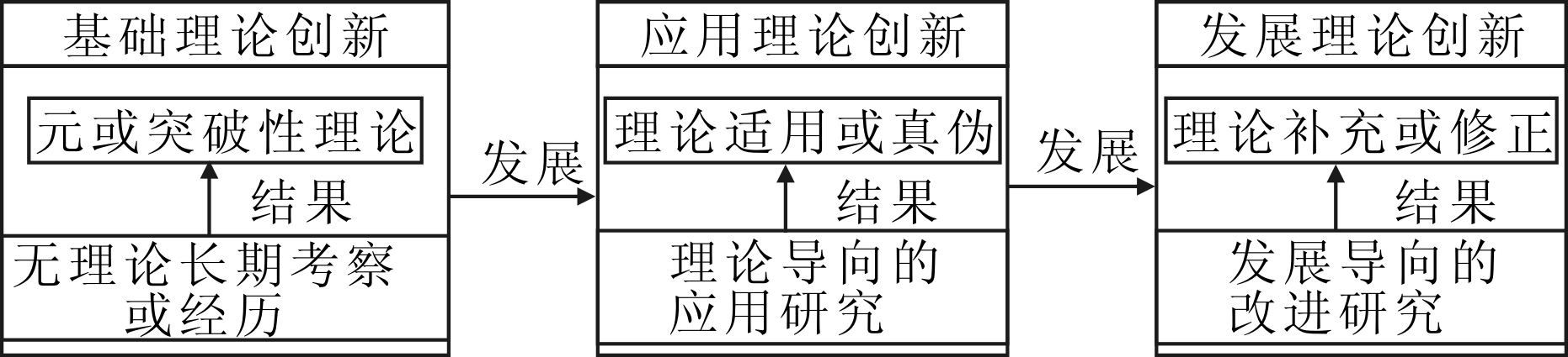 与市场创新一样,理论也可以通过研究对象与研究方式的重组实现创新。常见的研究类型有基础研究、应用研究、发展研究3种[20]:①基础型研究。是指原创性研究,其研究结果是原创性理论,是其它2种理论创新的基础,旨在把握事物发展规律与人类思维规律、全面认识社会实践新领域,进而创造新的理论及其知识体系;②应用型研究。与基础型研究不同,它是将基础性研究得出的原创性理论成果应用于具体领域、问题或情况,其本质是对现有理论的检验,或通过已有理论解决新问题;③发展型研究。该类型是对应用型研究的深化,是基础型理论研究的“改进版”。以社会实践为出发点和检验标准,在充分肯定和继承已有科学理论体系或基本原理的基础上,通过新观点、新范畴、新理论原则等,对原理论中错误成分加以批评纠正,对其中陈旧的成分加以扬弃[21]。与上述3种研究类型相对应,现有理论创新划分为基础理论创新、应用理论创新与发展理论创新3种,如图1所示。