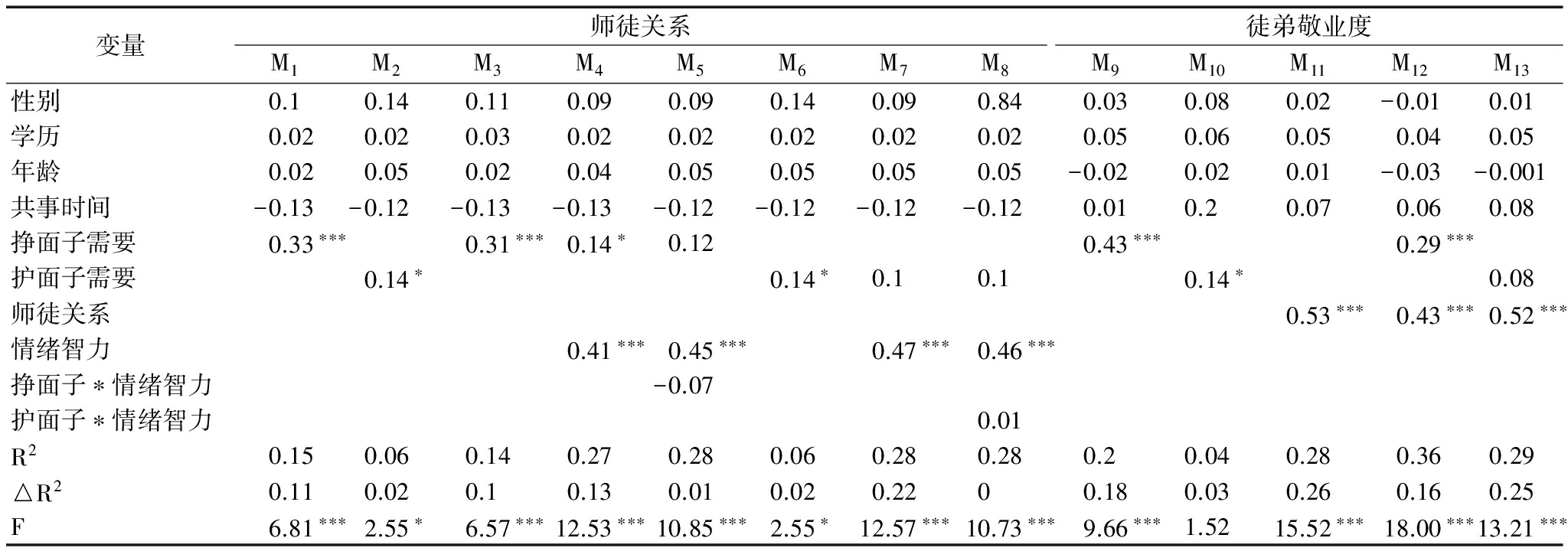 本研究共8个假设,即假设H1a,H1b,H2,H3a,H3b,H4a、H4b和H5,选用分层回归方法检验这8个假设,结果见表2。在检验假设H1a、H1b时,以师徒关系作为因变量,作两步回归分析。第一步,引入控制变量-员工性别、学历、年龄、与师傅共事时间;第二步引入自变量-师傅的挣面子需要和护面子需要。结果显示,师傅挣面子需要对师徒关系的回归系数β=0.33,在P<0.001的水平上显著,对师徒关系的解释变异量增加11%,由此验证了假设H1a;护面子需要对师徒关系的回归系数β=0.13,且在P<0.05的水平上显著,因此验证了假设H2a。