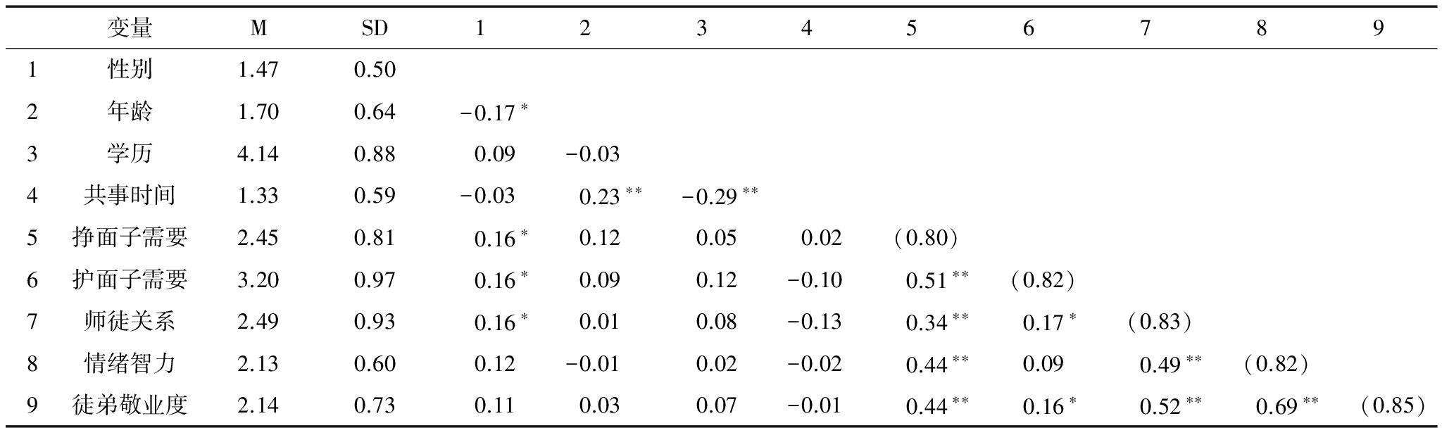 变量MSD1234567891性别1.470.502年龄1.700.64-0.17∗3学历4.140.880.09-0.034共事时间1.330.59-0.030.23∗∗-0.29∗∗5挣面子需要2.450.810.16∗0.120.050.02(0.80)6护面子需要3.200.970.16∗0.090.12-0.100.51∗∗(0.82)7师徒关系2.490.930.16∗0.010.08-0.130.34∗∗0.17∗(0.83)8情绪智力2.130.600.12-0.010.02-0.020.44∗∗0.090.49∗∗(0.82)9徒弟敬业度2.140.730.110.030.07-0.010.44∗∗0.16∗0.52∗∗0.69∗∗(0.85)