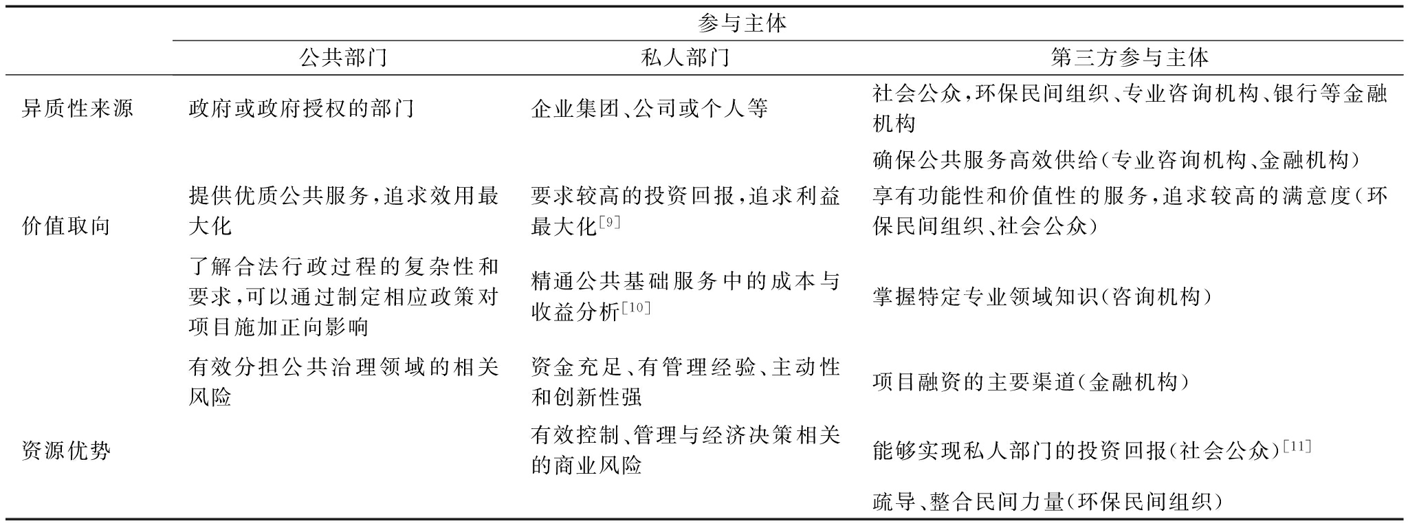 Verhoest等[5]认为,PPP模式将追求利益最大化的社会资本和非营利性的政府部门相结合,双方在优势资源上存在异质性。Elliott Sclar[6]研究了城市基础建设PPP项目中私人(追求投资回报)和政府(追求社会价值)间的矛盾。孙艳丽与岳树杰[7]认为,政府和企业在雾霾治理与项目投融资管理目标方面存在异质性,进而研究了环保PPP项目中政府和投融资群体间的非对称博弈。王雪原与王家苗[8]从政府、社会资本及社会公众关系视角,解构环保PPP项目,构建了基于契约精神,由政府监管、公众参与的协调机制。通过归纳现有环保PPP项目参与主体研究,本文认为环保PPP项目多元主体间的异质性主要源自两个方面,即价值取向与资源优势,如表1所示。