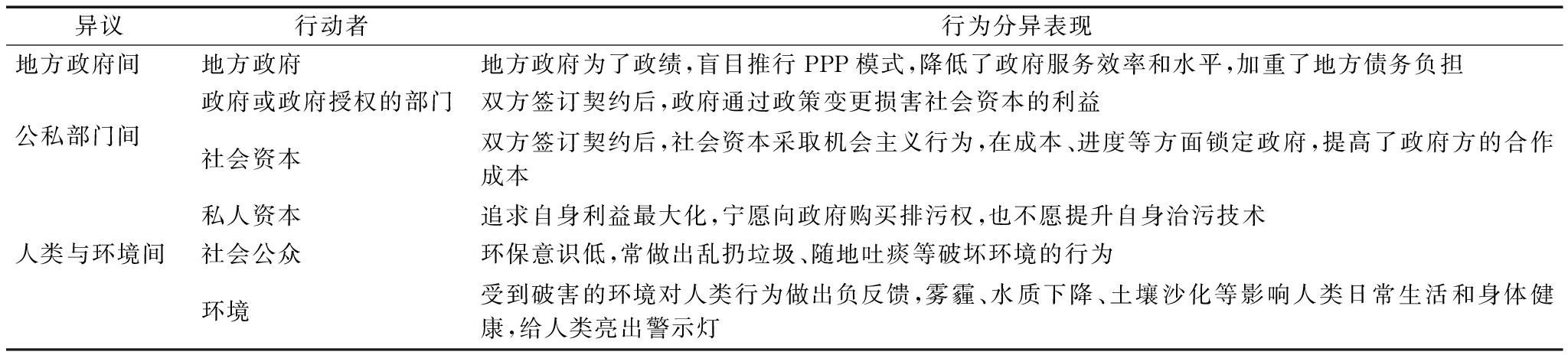 异议行动者行为分异表现地方政府间地方政府地方政府为了政绩,盲目推行PPP模式,降低了政府服务效率和水平,加重了地方债务负担公私部门间政府或政府授权的部门双方签订契约后,政府通过政策变更损害社会资本的利益社会资本双方签订契约后,社会资本采取机会主义行为,在成本、进度等方面锁定政府,提高了政府方的合作成本私人资本追求自身利益最大化,宁愿向政府购买排污权,也不愿提升自身治污技术人类与环境间社会公众环保意识低,常做出乱扔垃圾、随地吐痰等破坏环境的行为环境受到破害的环境对人类行为做出负反馈,雾霾、水质下降、土壤沙化等影响人类日常生活和身体健康,给人类亮出警示灯