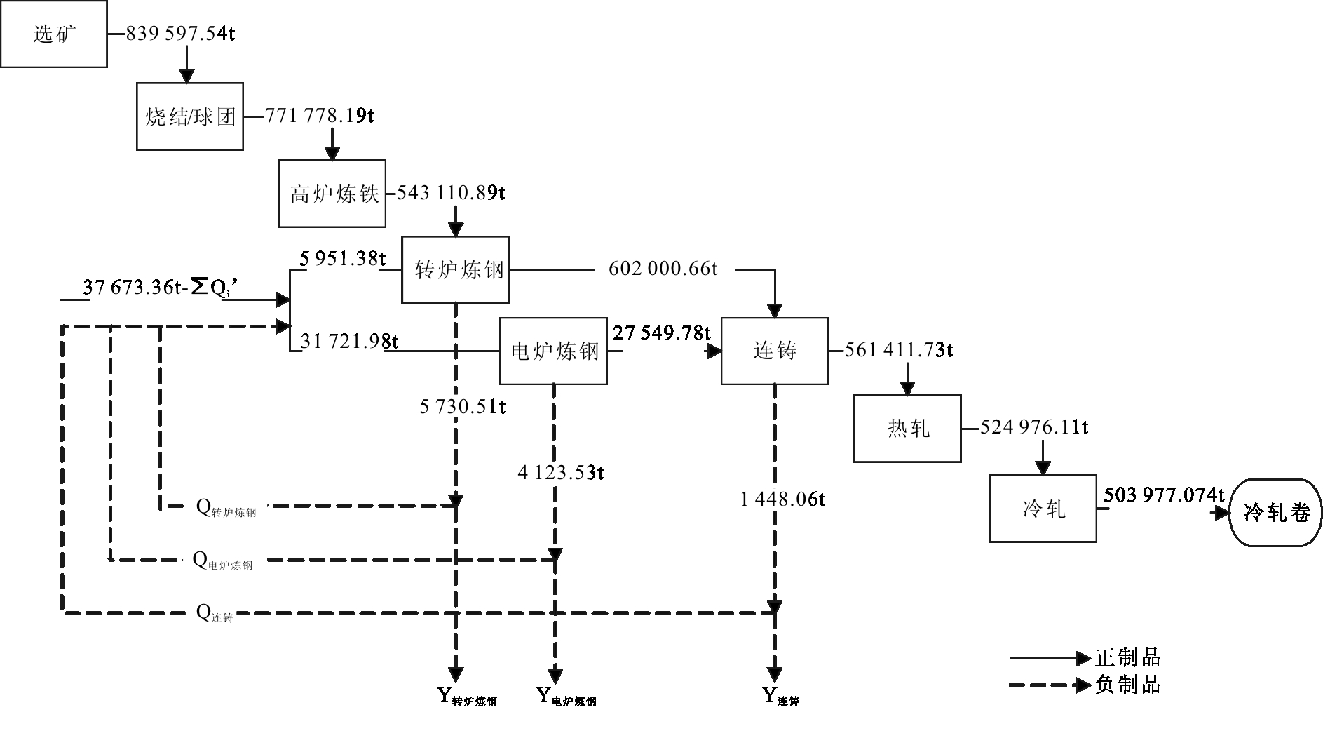 表2 各工序产成品、中间产品、废弃物和总产出质量 (单位:t)