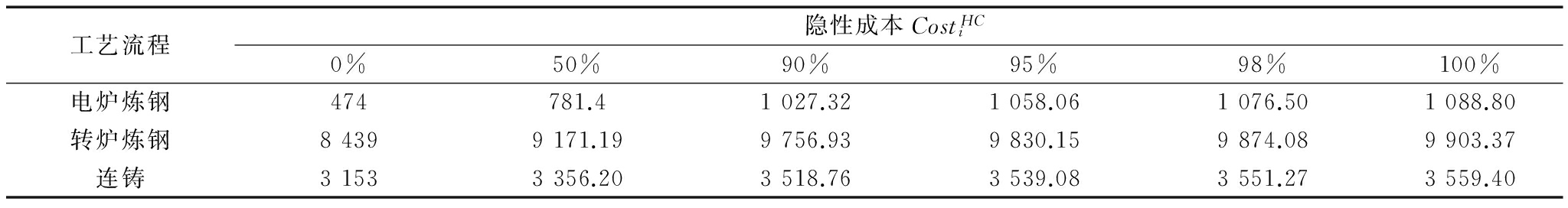 工艺流程隐性成本CostHCi0%50%90%95%98%100%电炉炼钢474781.41027.321058.061076.501088.80转炉炼钢84399171.199756.939830.159874.089903.37连铸31533356.203518.763539.083551.273559.40